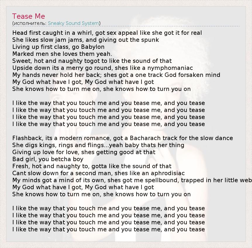 Head first caught in a whirl, got sex appeal like she got it for real She likes slow jam jams, and giving out the spunk Living up first class, go Babylon Marked men she loves them yeah. Sweet, hot and naughty togot to like the sound of that Upside down its a merry go round, shes like a nymphomaniac My hands never hold her back; shes got a one track God forsaken mind My God what have I got, My God what have I got She knows how to turn me on, she knows how to turn you on I like the way that you touch me and you tease me, and you tease I like the way that you touch me and you tease me, and you tease I like the way that you touch me and you tease me, and you tease I like the way that you touch me and you tease me, and you tease Flashback, its a modern romance, got a Bacharach track for the slow dance She digs kings, rings and flings...yeah baby thats her thing Giving up love for love, shes getting good at that Bad girl, you betcha boy Fresh, hot and naughty to, gotta like the sound of that Cant slow down for a second man, shes like an aphrodisiac My minds got a mind of its own, shes got me spellbound, trapped in her little web My God what have I got, My God what have I got She knows how to turn me on, she knows how to turn you on I like the way that you touch me and you tease me, and you tease I like the way that you touch me and you tease me, and you tease I like the way that you touch me and you tease me, and you tease I like the way that you touch me and you tease me, and you tease