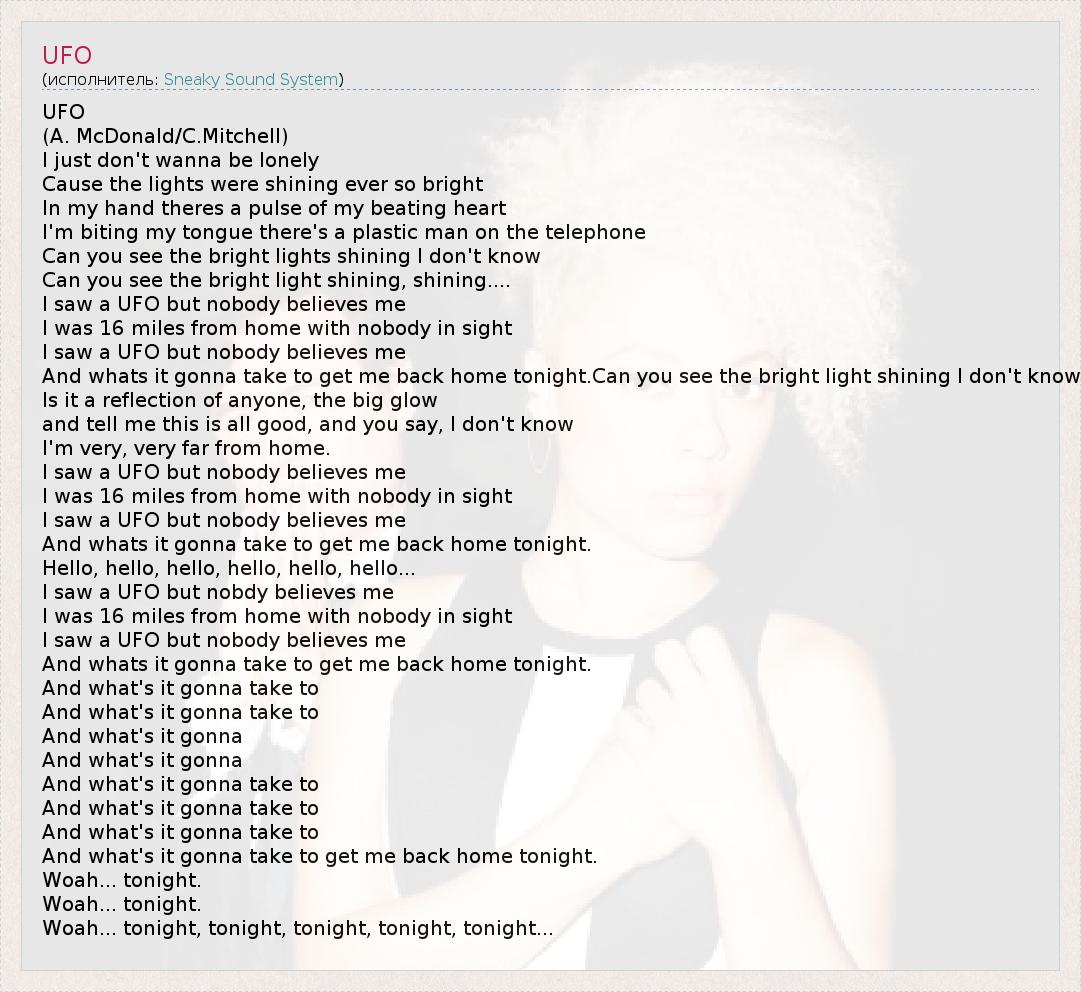 UFO (A. McDonald/C.Mitchell) I just don't wanna be lonely Cause the lights were shining ever so bright In my hand theres a pulse of my beating heart I'm biting my tongue there's a plastic man on the telephone Can you see the bright lights shining I don't know Can you see the bright light shining, shining.... I saw a UFO but nobody believes me I was 16 miles from home with nobody in sight I saw a UFO but nobody believes me And whats it gonna take to get me back home tonight.Can you see the bright light shining I don't know Is it a reflection of anyone, the big glow and tell me this is all good, and you say, I don't know I'm very, very far from home. I saw a UFO but nobody believes me I was 16 miles from home with nobody in sight I saw a UFO but nobody believes me And whats it gonna take to get me back home tonight. Hello, hello, hello, hello, hello, hello... I saw a UFO but nobdy believes me I was 16 miles from home with nobody in sight I saw a UFO but nobody believes me And whats it gonna take to get me back home tonight. And what's it gonna take to And what's it gonna take to And what's it gonna And what's it gonna And what's it gonna take to And what's it gonna take to And what's it gonna take to And what's it gonna take to get me back home tonight. Woah... tonight. Woah... tonight. Woah... tonight, tonight, tonight, tonight, tonight...