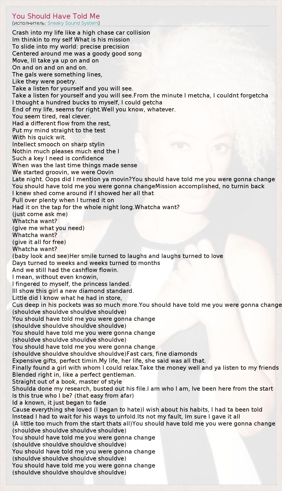 Crash into my life like a high chase car collision Im thinkin to my self What is his mission To slide into my world: precise precision Centered around me was a goody good song Move, Ill take ya up on and on On and on and on and on. The gals were something lines, Like they were poetry. Take a listen for yourself and you will see. Take a listen for yourself and you will see.From the minute I metcha, I couldnt forgetcha I thought a hundred bucks to myself, I could getcha End of my life, seems for right.Well you know, whatever. You seem tired, real clever. Had a different flow from the rest, Put my mind straight to the test With his quick wit. Intellect smooch on sharp stylin Nothin much pleases much end the I Such a key I need is confidence When was the last time things made sense We started groovin, we were Oovin Late night. Oops did I mention ya movin?You should have told me you were gonna change You should have told me you were gonna changeMission accomplished, no turnin back I knew shed come around if I showed her all that Pull over plenty when I turned it on Had it on the tap for the whole night long.Whatcha want? (just come ask me) Whatcha want? (give me what you need) Whatcha want? (give it all for free) Whatcha want? (baby look and see)Her smile turned to laughs and laughs turned to love Days turned to weeks and weeks turned to months And we still had the cashflow flowin. I mean, without even knowin, I fingered to myself, the princess landed. Ill show this girl a new diamond standard. Little did I know what he had in store, Cus deep in his pockets was so much more.You should have told me you were gonna change (shouldve shouldve shouldve shouldve) You should have told me you were gonna change (shouldve shouldve shouldve shouldve) You should have told me you were gonna change (shouldve shouldve shouldve shouldve) You should have told me you were gonna change (shouldve shouldve shouldve shouldve)Fast cars, fine diamonds Expensive gifts, perfect timin.My life, her life, she said was all that. Finally found a girl with whom I could relax.Take the money well and ya listen to my friends Blended right in, like a perfect gentleman. Straight out of a book, master of style Shoulda done my research, busted out his file.I am who I am, Ive been here from the start Is this true who I be? (that easy from afar) Id a known, it just began to fade Cause everything she loved (I began to hate)I wish about his habits, I had ta been told Instead I had to wait for his ways to unfold.Its not my fault, Im sure I gave it all (A little too much from the start thats all)You should have told me you were gonna change (shouldve shouldve shouldve shouldve) You should have told me you were gonna change (shouldve shouldve shouldve shouldve) You should have told me you were gonna change (shouldve shouldve shouldve shouldve) You should have told me you were gonna change (shouldve shouldve shouldve shouldve)