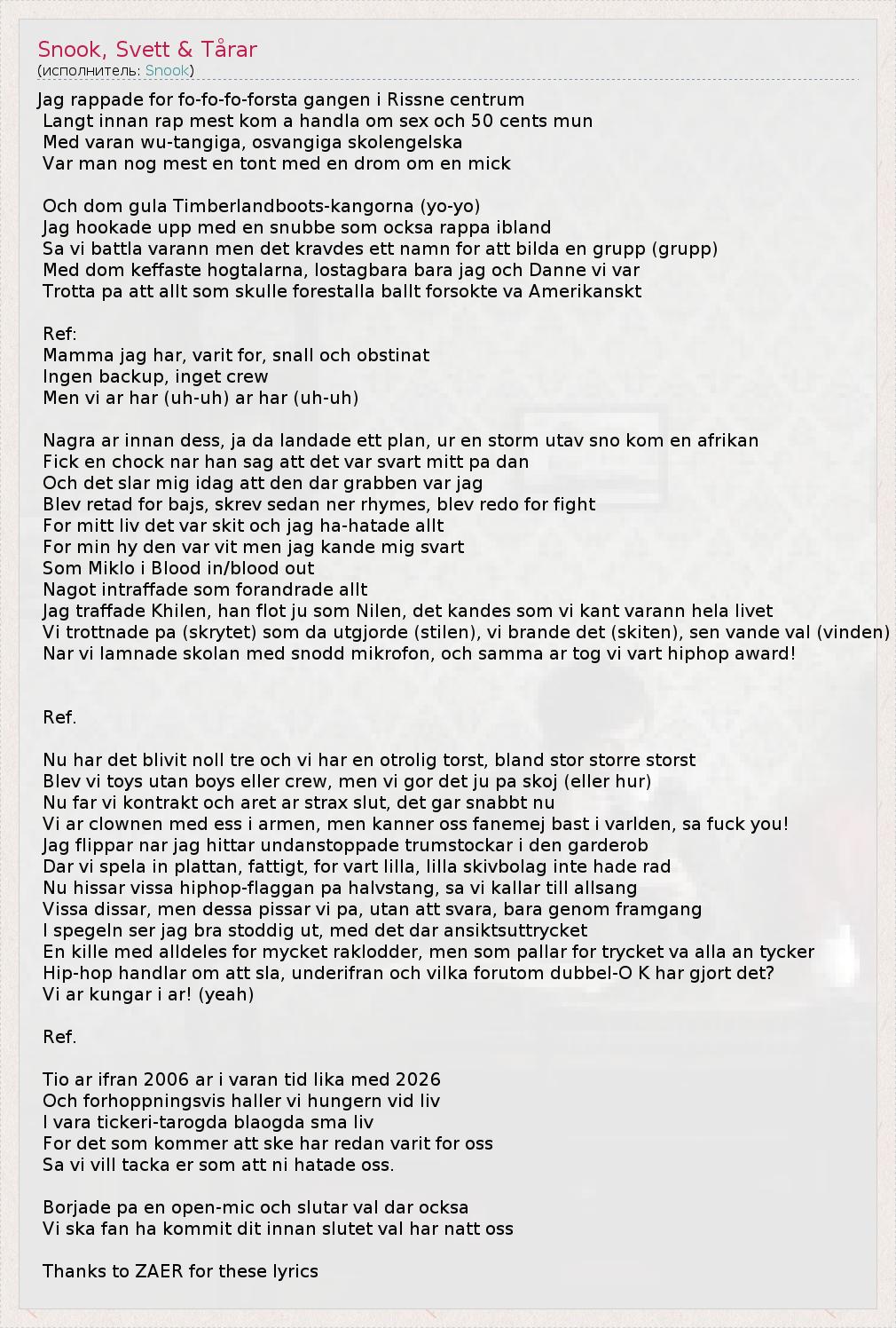 А как ты думаешь, о чем песня "Snook, Svett & Tårar" ?