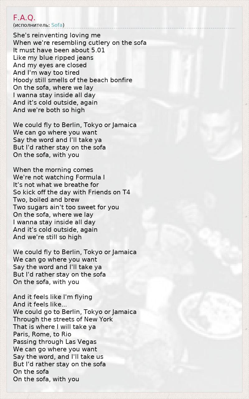 She's reinventing loving me When we're resembling cutlery on the sofa It must have been about 5.01 Like my blue ripped jeans And my eyes are closed And I'm way too tired Hoody still smells of the beach bonfire On the sofa, where we lay I wanna stay inside all day And it's cold outside, again And we're both so high We could fly to Berlin, Tokyo or Jamaica We can go where you want Say the word and I'll take ya But I'd rather stay on the sofa On the sofa, with you When the morning comes We're not watching Formula I It's not what we breathe for So kick off the day with Friends on T4 Two, boiled and brew Two sugars ain't too sweet for you On the sofa, where we lay I wanna stay inside all day And it's cold outside, again And we're still so high We could fly to Berlin, Tokyo or Jamaica We can go where you want Say the word and I'll take ya But I'd rather stay on the sofa On the sofa, with you And it feels like I'm flying And it feels like... We could go to Berlin, Tokyo or Jamaica Through the streets of New York That is where I will take ya Paris, Rome, to Rio Passing through Las Vegas We can go where you want Say the word, and I'll take us But I'd rather stay on the sofa On the sofa On the sofa, with you