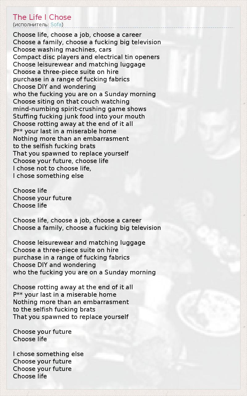 Choose life, choose a job, choose a career Choose a family, choose a fucking big television Choose washing machines, cars Compact disc players and electrical tin openers Choose leisurewear and matching luggage Choose a three-piece suite on hire purchase in a range of fucking fabrics Choose DIY and wondering who the fucking you are on a Sunday morning Choose siting on that couch watching mind-numbing spirit-crushing game shows Stuffing fucking junk food into your mouth Choose rotting away at the end of it all P** your last in a miserable home Nothing more than an embarrasment to the selfish fucking brats That you spawned to replace yourself Choose your future, choose life I chose not to choose life, I chose something else Choose life Choose your future Choose life Choose life, choose a job, choose a career Choose a family, choose a fucking big television Choose leisurewear and matching luggage Choose a three-piece suite on hire purchase in a range of fucking fabrics Choose DIY and wondering who the fucking you are on a Sunday morning Choose rotting away at the end of it all P** your last in a miserable home Nothing more than an embarrasment to the selfish fucking brats That you spawned to replace yourself Choose your future Choose life I chose something else Choose your future Choose your future Choose life