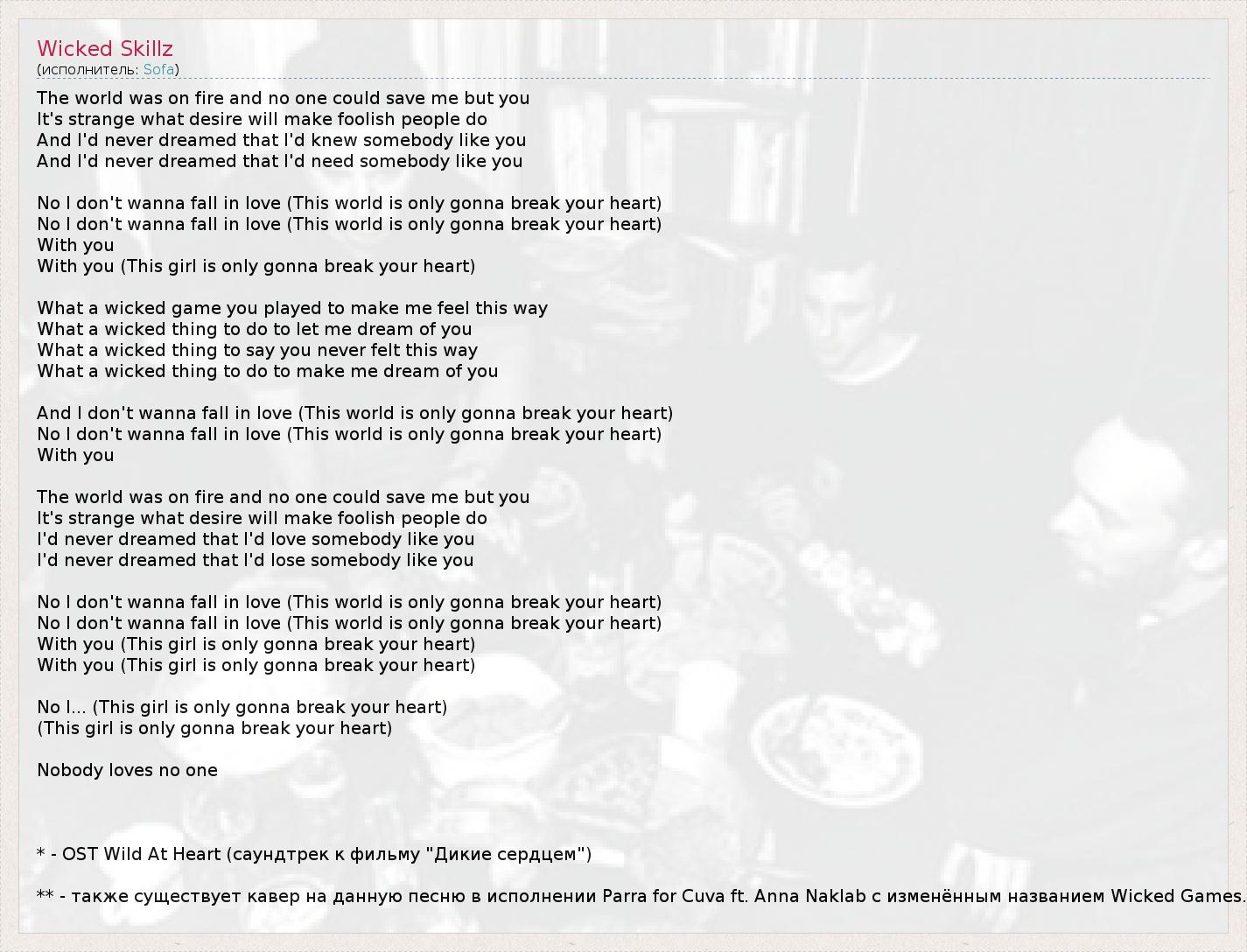 The world was on fire and no one could save me but you It's strange what desire will make foolish people do And I'd never dreamed that I'd knew somebody like you And I'd never dreamed that I'd need somebody like you No I don't wanna fall in love (This world is only gonna break your heart) No I don't wanna fall in love (This world is only gonna break your heart) With you With you (This girl is only gonna break your heart) What a wicked game you played to make me feel this way What a wicked thing to do to let me dream of you What a wicked thing to say you never felt this way What a wicked thing to do to make me dream of you And I don't wanna fall in love (This world is only gonna break your heart) No I don't wanna fall in love (This world is only gonna break your heart) With you The world was on fire and no one could save me but you It's strange what desire will make foolish people do I'd never dreamed that I'd love somebody like you I'd never dreamed that I'd lose somebody like you No I don't wanna fall in love (This world is only gonna break your heart) No I don't wanna fall in love (This world is only gonna break your heart) With you (This girl is only gonna break your heart) With you (This girl is only gonna break your heart) No I... (This girl is only gonna break your heart) (This girl is only gonna break your heart) Nobody loves no one * - OST Wild At Heart (саундтрек к фильму "Дикие сердцем") ** - также существует кавер на данную песню в исполнении Parra for Cuva ft. Anna Naklab с изменённым названием Wicked Games.