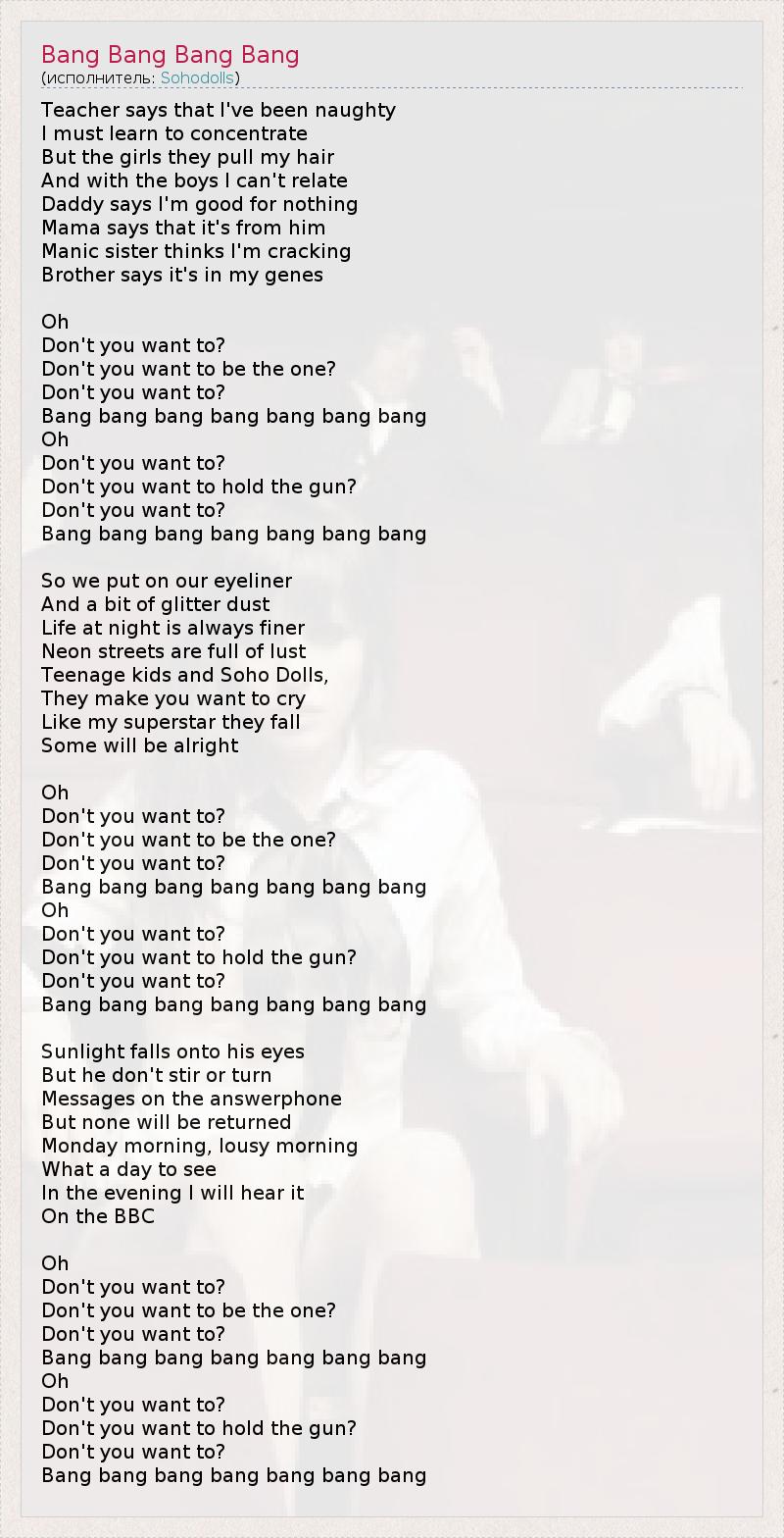 Учитель говорит, что я непослушная, И мне нужно учиться сосредотачиваться. Но девчонки дергают меня за волосы, И отношения с мальчиками не складываются. Отец говорит, я ни на что не гожусь, Мама говорит, это у меня от него. Маньячка-сестра думает, что я дерусь, Брат говорит, это у меня в генах. О А ты не хочешь? Ты не хочешь быть единственным? А ты не хочешь? Бах бах бах бах бах бах бах О А ты не хочешь? Ты не хочешь навести на кого-нибудь пистолет? А ты не хочешь? Бах бах бах бах бах бах бах Мы красим глаза подводкой И блестящими тенями. Ночью жизнь всегда прекрасна, Улицы полны неона и страсти. Подростки и девочки из Сохо* - От них тебе хочется кричать. Они становятся падшими, как суперзвезды, С некоторыми все будет в порядке. О А ты не хочешь? Ты не хочешь быть тем самым? А ты не хочешь? Бах бах бах бах бах бах бах О А ты не хочешь? Ты не хочешь навести на кого-нибудь пистолет? А ты не хочешь? Бах бах бах бах бах бах бах Солнце светит ему в глаза, Но он не шевелится и не отворачивается. На автоответчике есть сообщения, Но на них не будет ответа. Утро понедельника, отвратительное утро, Что за день для встречи! Вечером я услышу это На канале BBC. О А ты не хочешь? Ты не хочешь быть тем самым? А ты не хочешь? Бах бах бах бах бах бах бах О А ты не хочешь? Ты не хочешь навести на кого-нибудь пистолет? А ты не хочешь? Бах бах бах бах бах бах бах * - Сохо - район в центральной части Лондона; средоточие ресторанов, ночных клубов, казино, стриптизов и увеселительных заведений, часто сомнительного характера