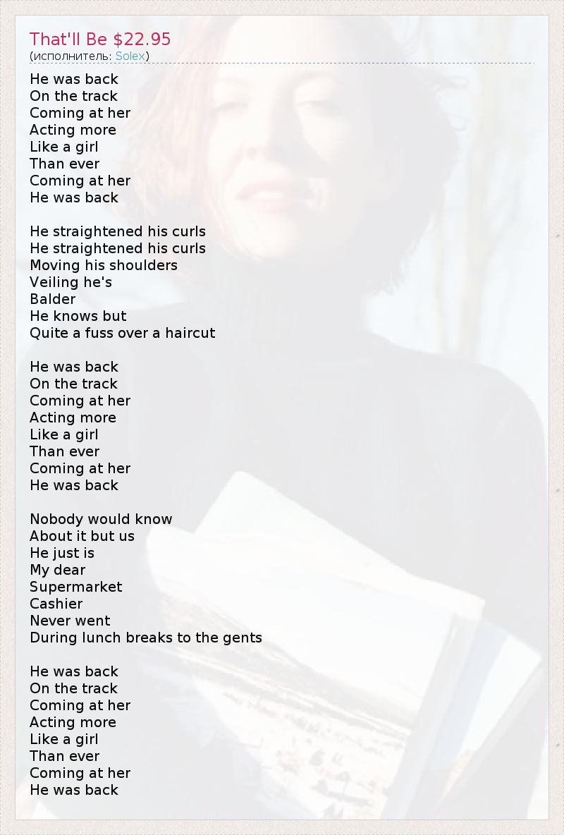 He was back On the track Coming at her Acting more Like a girl Than ever Coming at her He was back He straightened his curls He straightened his curls Moving his shoulders Veiling he's Balder He knows but Quite a fuss over a haircut He was back On the track Coming at her Acting more Like a girl Than ever Coming at her He was back Nobody would know About it but us He just is My dear Supermarket Cashier Never went During lunch breaks to the gents He was back On the track Coming at her Acting more Like a girl Than ever Coming at her He was back