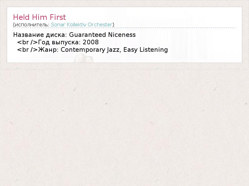 Это интересно:В 2007 году немецкому лейблу Sonar Kollektiv, созданному известной и любимой многими группой Jazzanova, исполнилось 10 лет и, в честь этого знаменательного события, был основан Sonar Kollektiv Orchester. Оркестр состоит из 15 музыкантов; вокальной, духовой, струнной и ритм секций и представляет кавер-версии известнейших вещей из каталога лейбла и несколько новых композиций.