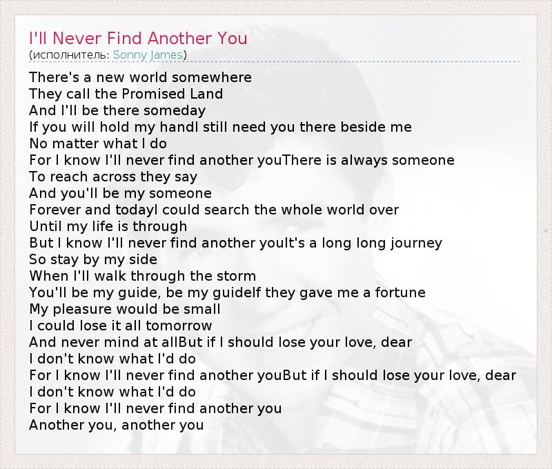 There's a new world somewhere They call the Promised Land And I'll be there someday If you will hold my handI still need you there beside me No matter what I do For I know I'll never find another youThere is always someone To reach across they say And you'll be my someone Forever and todayI could search the whole world over Until my life is through But I know I'll never find another youIt's a long long journey So stay by my side When I'll walk through the storm You'll be my guide, be my guideIf they gave me a fortune My pleasure would be small I could lose it all tomorrow And never mind at allBut if I should lose your love, dear I don't know what I'd do For I know I'll never find another youBut if I should lose your love, dear I don't know what I'd do For I know I'll never find another you Another you, another you