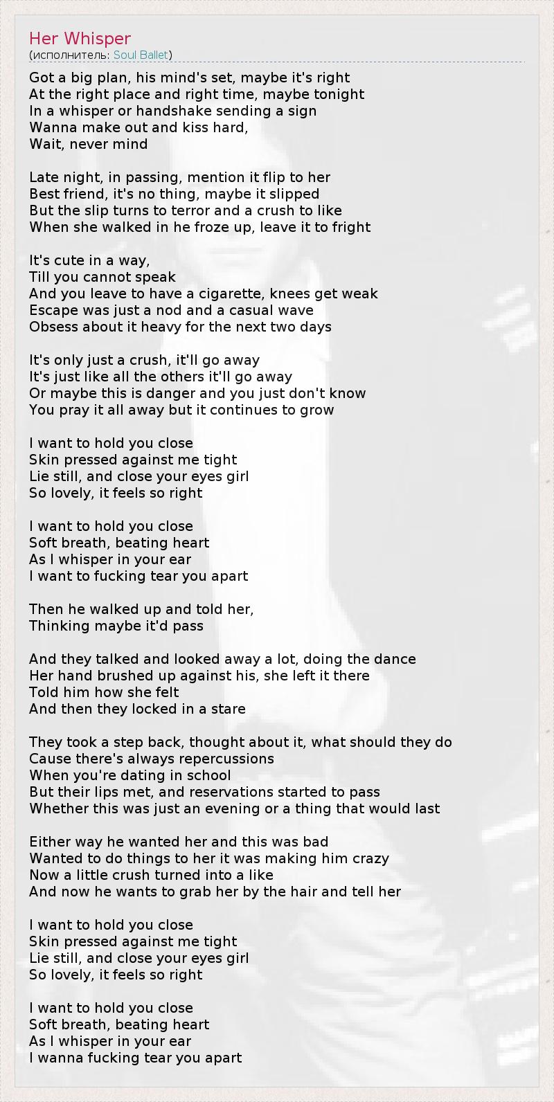 В голове есть план, он всё решил, может, это и верно, В нужном месте и в нужное время, может, сегодня Сделать намек, шепотом или пожав руку, Что хочет подружиться и крепко поцеловать, Стой, не бери в голову. Поздно ночью он случайно обмолвился об этом ее лучшей подруге, Нет, это ничего не значит, просто вырвалось. Но эта обмолвка вызывает в нем ужас и желание понравиться. Когда она вошла, он застыл от страха. В какой-то степени это даже интересно, Пока ты не можешь и слова сказать, И ты идешь за сигаретой, а ноги подкашиваются. Спасением был лишь кивок и непроизвольный жест рукой. А потом воспоминания об этом преследуют тебя в течение двух дней. Это всего лишь влечение, это пройдет, Это как обычно, это пройдет, Или может это опасно, а ты и не знаешь, Ты молишься, чтобы это ушло, но чувство только нарастает. Я хочу тебя прижать к себе, Кожа касается моей. Лежи тихо, и закрой глаза, девочка, Так приятно, как же это хорошо. Я хочу тебя прижать к себе. Нежное дыхание, быстро бьется сердце, Когда я шепчу тебе на ухо: "Я чертовски хочу разорвать тебя на куски!" Потом он подошел к ней и заговорил, Надеясь, что, может, это пройдет. И, танцуя, они говорили и постоянно отводили взгляд. Ее рука случайно задела его, и она не убрала ее, Она сказала, что чувствовала, После они пристально посмотрели друг на друга. Сделали шаг назад, думая о том, что им теперь делать, Потому что, если встречаешься с кем-то из школы, Всегда будут последствия. Но их губы встретились, и вес сомнения стал уходить, Без разницы, будет ли это только на вечер или нечто большее. В любом случае, он хотел ее и это плохо, Хотел сделать это с ней, и это сводило ее с ума. Теперь просто к желанию прибавилась сильная симпатия, И сейчас он хочет схватить ее за волосы и сказать: Я хочу тебя прижать к себе, Кожа касается моей. Лежи тихо, и закрой глаза, девочка, Так приятно, как же это хорошо. Я хочу тебя прижать к себе. Нежное дыхание, быстро бьется сердце, Когда я шепчу тебе на ухо: "Я чертовски хочу разорвать тебя на куски!"