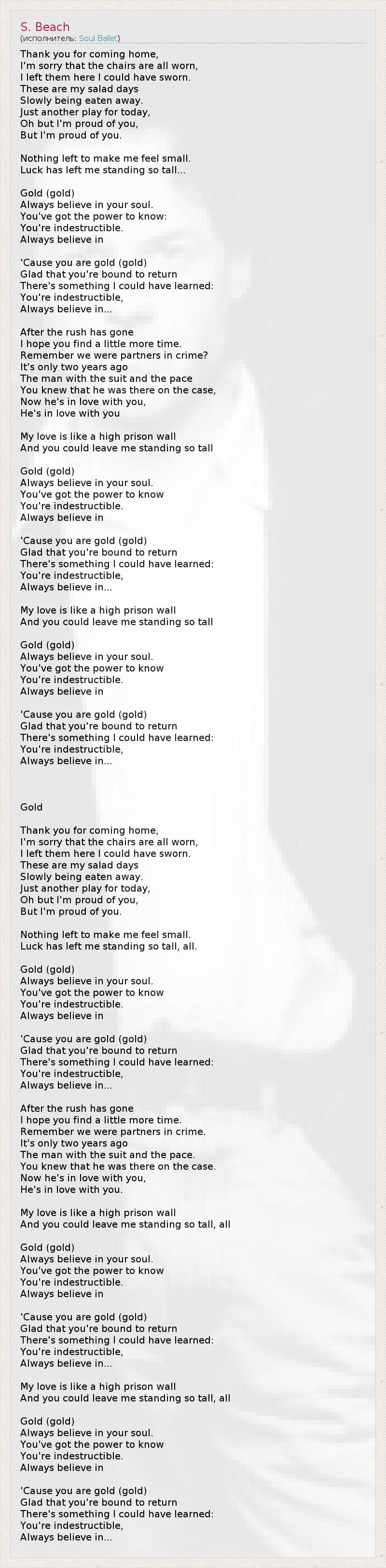 Thank you for coming home, I'm sorry that the chairs are all worn, I left them here I could have sworn. These are my salad days Slowly being eaten away. Just another play for today, Oh but I'm proud of you, But I'm proud of you. Nothing left to make me feel small. Luck has left me standing so tall... Gold (gold) Always believe in your soul. You've got the power to know: You're indestructible. Always believe in 'Cause you are gold (gold) Glad that you're bound to return There's something I could have learned: You're indestructible, Always believe in... After the rush has gone I hope you find a little more time. Remember we were partners in crime? It's only two years ago The man with the suit and the pace You knew that he was there on the case, Now he's in love with you, He's in love with you My love is like a high prison wall And you could leave me standing so tall Gold (gold) Always believe in your soul. You've got the power to know You're indestructible. Always believe in 'Cause you are gold (gold) Glad that you're bound to return There's something I could have learned: You're indestructible, Always believe in... My love is like a high prison wall And you could leave me standing so tall Gold (gold) Always believe in your soul. You've got the power to know You're indestructible. Always believe in 'Cause you are gold (gold) Glad that you're bound to return There's something I could have learned: You're indestructible, Always believe in... Gold Thank you for coming home, I'm sorry that the chairs are all worn, I left them here I could have sworn. These are my salad days Slowly being eaten away. Just another play for today, Oh but I'm proud of you, But I'm proud of you. Nothing left to make me feel small. Luck has left me standing so tall, all. Gold (gold) Always believe in your soul. You've got the power to know You're indestructible. Always believe in 'Cause you are gold (gold) Glad that you're bound to return There's something I could have learned: You're indestructible, Always believe in... After the rush has gone I hope you find a little more time. Remember we were partners in crime. It's only two years ago The man with the suit and the pace. You knew that he was there on the case. Now he's in love with you, He's in love with you. My love is like a high prison wall And you could leave me standing so tall, all Gold (gold) Always believe in your soul. You've got the power to know You're indestructible. Always believe in 'Cause you are gold (gold) Glad that you're bound to return There's something I could have learned: You're indestructible, Always believe in... My love is like a high prison wall And you could leave me standing so tall, all Gold (gold) Always believe in your soul. You've got the power to know You're indestructible. Always believe in 'Cause you are gold (gold) Glad that you're bound to return There's something I could have learned: You're indestructible, Always believe in...