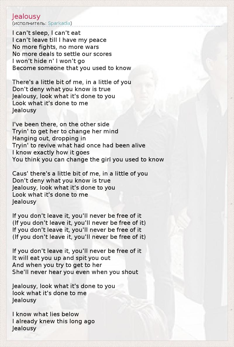 Я не могу спать, не могу есть, Я не могу уйти, пока не обрету покой. Хватит борьбы, хватит войн, Хватит поступать так, чтобы свести друг с другом счёты. Я не скроюсь и не стану Тем, кого ты раньше знала. В уголках твоего сердца жива частичка меня, Не отрицай очевидного. Ревность – взгляни, что она сделала с тобой, Взгляни, что она сделала со мной! Ревность! Я был на другой стороне, Стараясь переубедить её. Сопротивляюсь, действую, Стараясь возродить былое. Я точно знаю Ты думаешь, что можешь изменить девушку, которую знал раньше. Ведь в уголках твоего сердца жива частичка меня, Не отрицай очевидного. Ревность – взгляни, что она сделала с тобой, Взгляни, что она сделала со мной! Ревность! Если ты не откажешься от неё, то никогда не освободишься, (Если ты не откажешься от неё, то никогда не освободишься) Если ты не откажешься от неё, то никогда не освободишься! (Если ты не откажешься от неё, то никогда не освободишься) Если ты не откажешься от неё, то никогда не освободишься, Она прожуёт и выплюнет тебя, И когда ты попробуешь подступиться к ней, Она не услышит тебя, как бы ты ни кричал. Ревность – взгляни, что она сделала с тобой, Взгляни, что она сделала со мной! Ревность! Я знаю, в чём причина, Я знал это уже давно... Ревность!