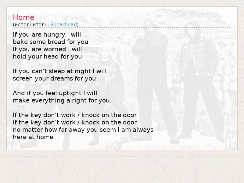 If you are hungry I will bake some bread for you If you are worried I will hold your head for you If you can't sleep at night I will screen your dreams for you And if you feel uptight I will make everything alright for you. If the key don't work / knock on the door If the key don't work / knock on the door no matter how far away you seem I am always here at home