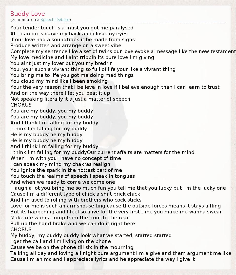 Your tender touch is a must you got me paralysed All I can do is curve my back and close my eyes If our love had a soundtrack it be made from sighs Produce written and arrange on a sweet vibe Complete my sentence like a set of twins our love evoke a message like the new testament My love medicine and I aint trippin its pure love I m giving You aint just my lover but you my bredrin You, your such a vivrant thing so full of life your like a vivrant thing You bring me to life you got me doing mad things You cloud my mind like I been smoking Your the very reason that I believe in love if I believe enough than I can learn to trust And on the way there I let you beat it up Not speaking literally it s just a matter of speech CHORUS You are my buddy, you my buddy You are my buddy, you my buddy And I think I m falling for my buddy I think I m falling for my buddy He is my buddy he my buddy He is my buddy he my buddy And I think I m falling for my buddy I think I m falling for my buddyOur current affairs are matters for the mind When I m with you I have no concept of time I can speak my mind my chakras realign You ignite the spark in the hottest part of me You touch the realms of speech I speak in tongues And when we ready to come we come one I laugh a lot you bring me so much fun you tell me that you lucky but I m the lucky one Cause I m a different type of chick a shift brick chick And I m used to rolling with brothers who cock sticks Love for me is such an armshouse ting cause the outside forces means it stays a fling But its happening and I feel so alive for the very first time you make me wanna swear Make me wanna jump from the front to the rear Pull up the hand brake and we can do it right here CHORUS My buddy, my buddy buddy look what we started, started started I get the call and I m living on the phone Cause we be on the phone till six in the mourning Talking all day and loving all night pure argument I m a give and them argument me like Cause I m an mc and I appreciate lyrics and he appreciate the way I give it