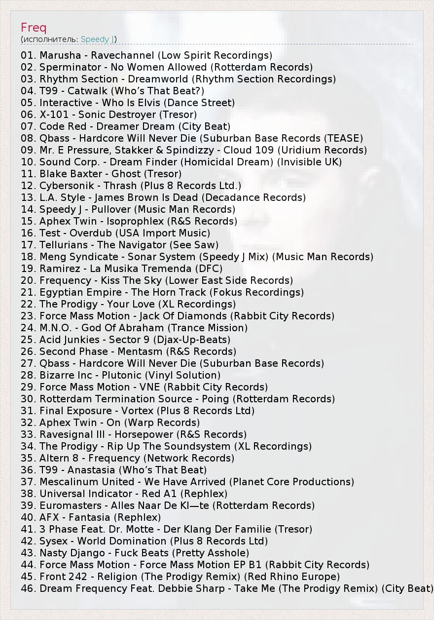 01. Marusha - Ravechannel (Low Spirit Recordings) 02. Sperminator - No Women Allowed (Rotterdam Records) 03. Rhythm Section - Dreamworld (Rhythm Section Recordings) 04. T99 - Catwalk (Who’s That Beat?) 05. Interactive - Who Is Elvis (Dance Street) 06. X-101 - Sonic Destroyer (Tresor) 07. Code Red - Dreamer Dream (City Beat) 08. Qbass - Hardcore Will Never Die (Suburban Base Records (TEASE) 09. Mr. E Pressure, Stakker & Spindizzy - Cloud 109 (Uridium Records) 10. Sound Corp. - Dream Finder (Homicidal Dream) (Invisible UK) 11. Blake Baxter - Ghost (Tresor) 12. Cybersonik - Thrash (Plus 8 Records Ltd.) 13. L.A. Style - James Brown Is Dead (Decadance Records) 14. Speedy J - Pullover (Music Man Records) 15. Aphex Twin - Isoprophlex (R&S Records) 16. Test - Overdub (USA Import Music) 17. Tellurians - The Navigator (See Saw) 18. Meng Syndicate - Sonar System (Speedy J Mix) (Music Man Records) 19. Ramirez - La Musika Tremenda (DFC) 20. Frequency - Kiss The Sky (Lower East Side Records) 21. Egyptian Empire - The Horn Track (Fokus Recordings) 22. The Prodigy - Your Love (XL Recordings) 23. Force Mass Motion - Jack Of Diamonds (Rabbit City Records) 24. M.N.O. - God Of Abraham (Trance Mission) 25. Acid Junkies - Sector 9 (Djax-Up-Beats) 26. Second Phase - Mentasm (R&S Records) 27. Qbass - Hardcore Will Never Die (Suburban Base Records) 28. Bizarre Inc - Plutonic (Vinyl Solution) 29. Force Mass Motion - VNE (Rabbit City Records) 30. Rotterdam Termination Source - Poing (Rotterdam Records) 31. Final Exposure - Vortex (Plus 8 Records Ltd) 32. Aphex Twin - On (Warp Records) 33. Ravesignal III - Horsepower (R&S Records) 34. The Prodigy - Rip Up The Soundsystem (XL Recordings) 35. Altern 8 - Frequency (Network Records) 36. T99 - Anastasia (Who’s That Beat) 37. Mescalinum United - We Have Arrived (Planet Core Productions) 38. Universal Indicator - Red A1 (Rephlex) 39. Euromasters - Alles Naar De Kl—te (Rotterdam Records) 40. AFX - Fantasia (Rephlex) 41. 3 Phase Feat. Dr. Motte - Der Klang Der Familie (Tresor) 42. Sysex - World Domination (Plus 8 Records Ltd) 43. Nasty Django - Fuck Beats (Pretty Asshole) 44. Force Mass Motion - Force Mass Motion EP B1 (Rabbit City Records) 45. Front 242 - Religion (The Prodigy Remix) (Red Rhino Europe) 46. Dream Frequency Feat. Debbie Sharp - Take Me (The Prodigy Remix) (City Beat)