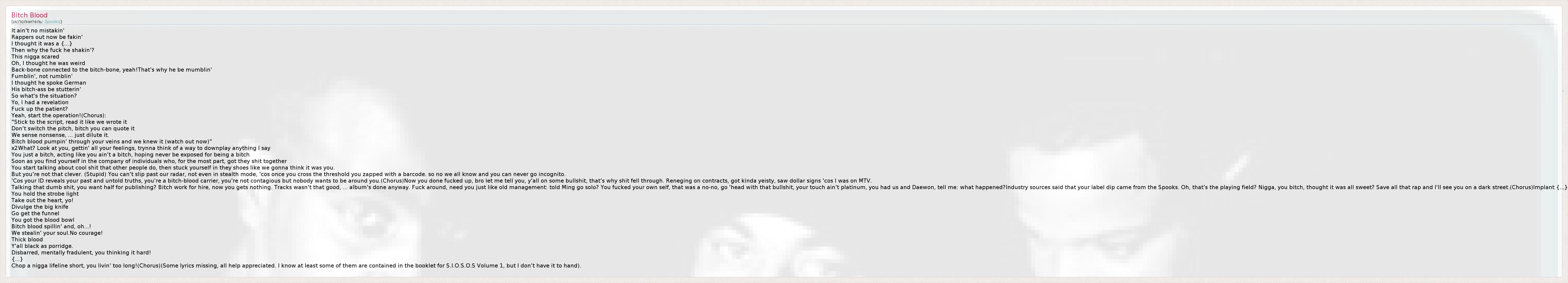 Chop a nigga lifeline short, you livin' too long!(Chorus)(Some lyrics missing, all help appreciated. I know at least some of them are contained in the booklet for S.I.O.S.O.S Volume 1, but I don't have it to hand).