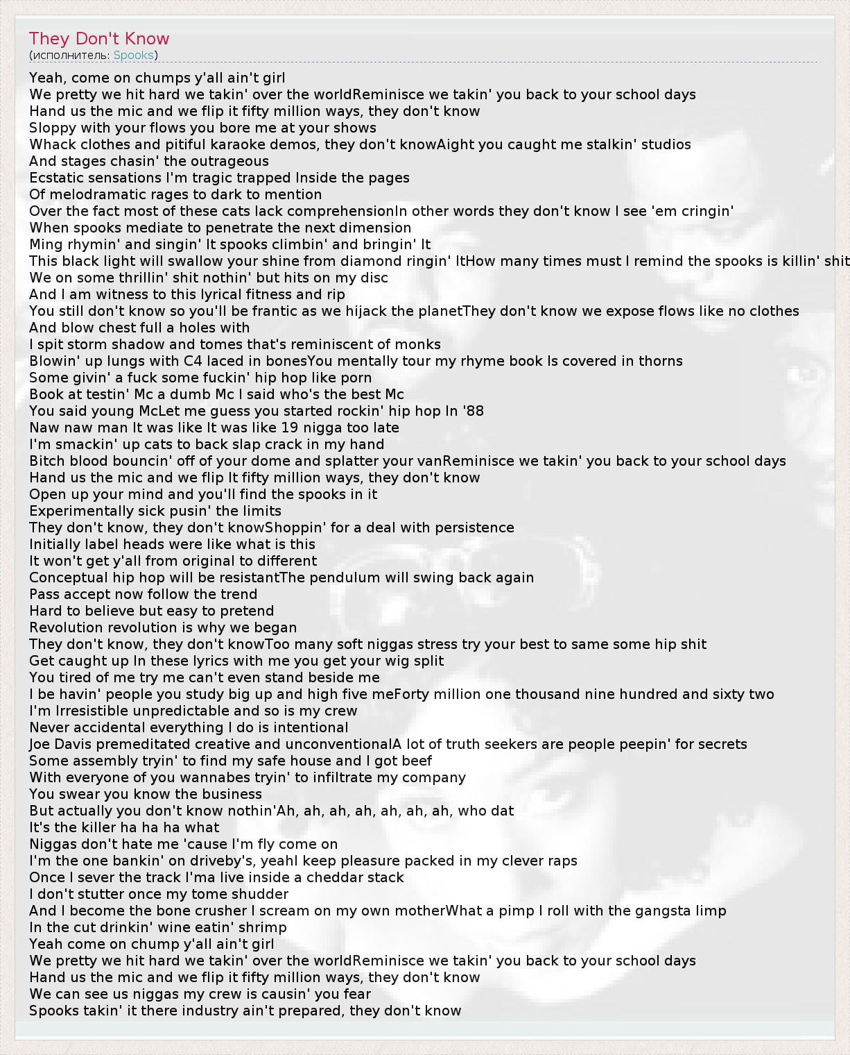 Yeah, come on chumps y'all ain't girl We pretty we hit hard we takin' over the worldReminisce we takin' you back to your school days Hand us the mic and we flip it fifty million ways, they don't know Sloppy with your flows you bore me at your shows Whack clothes and pitiful karaoke demos, they don't knowAight you caught me stalkin' studios And stages chasin' the outrageous Ecstatic sensations I'm tragic trapped Inside the pages Of melodramatic rages to dark to mention Over the fact most of these cats lack comprehensionIn other words they don't know I see 'em cringin' When spooks mediate to penetrate the next dimension Ming rhymin' and singin' It spooks climbin' and bringin' It This black light will swallow your shine from diamond ringin' ItHow many times must I remind the spooks is killin' shit We on some thrillin' shit nothin' but hits on my disc And I am witness to this lyrical fitness and rip You still don't know so you'll be frantic as we hijack the planetThey don't know we expose flows like no clothes And blow chest full a holes with I spit storm shadow and tomes that's reminiscent of monks Blowin' up lungs with C4 laced in bonesYou mentally tour my rhyme book Is covered in thorns Some givin' a fuck some fuckin' hip hop like porn Book at testin' Mc a dumb Mc I said who's the best Mc You said young McLet me guess you started rockin' hip hop In '88 Naw naw man It was like It was like 19 nigga too late I'm smackin' up cats to back slap crack in my hand Bitch blood bouncin' off of your dome and splatter your vanReminisce we takin' you back to your school days Hand us the mic and we flip It fifty million ways, they don't know Open up your mind and you'll find the spooks in it Experimentally sick pusin' the limits They don't know, they don't knowShoppin' for a deal with persistence Initially label heads were like what is this It won't get y'all from original to different Conceptual hip hop will be resistantThe pendulum will swing back again Pass accept now follow the trend Hard to believe but easy to pretend Revolution revolution is why we began They don't know, they don't knowToo many soft niggas stress try your best to same some hip shit Get caught up In these lyrics with me you get your wig split You tired of me try me can't even stand beside me I be havin' people you study big up and high five meForty million one thousand nine hundred and sixty two I'm Irresistible unpredictable and so is my crew Never accidental everything I do is intentional Joe Davis premeditated creative and unconventionalA lot of truth seekers are people peepin' for secrets Some assembly tryin' to find my safe house and I got beef With everyone of you wannabes tryin' to infiltrate my company You swear you know the business But actually you don't know nothin'Ah, ah, ah, ah, ah, ah, ah, who dat It's the killer ha ha ha what Niggas don't hate me 'cause I'm fly come on I'm the one bankin' on driveby's, yeahI keep pleasure packed in my clever raps Once I sever the track I'ma live inside a cheddar stack I don't stutter once my tome shudder And I become the bone crusher I scream on my own motherWhat a pimp I roll with the gangsta limp In the cut drinkin' wine eatin' shrimp Yeah come on chump y'all ain't girl We pretty we hit hard we takin' over the worldReminisce we takin' you back to your school days Hand us the mic and we flip it fifty million ways, they don't know We can see us niggas my crew is causin' you fear Spooks takin' it there industry ain't prepared, they don't know