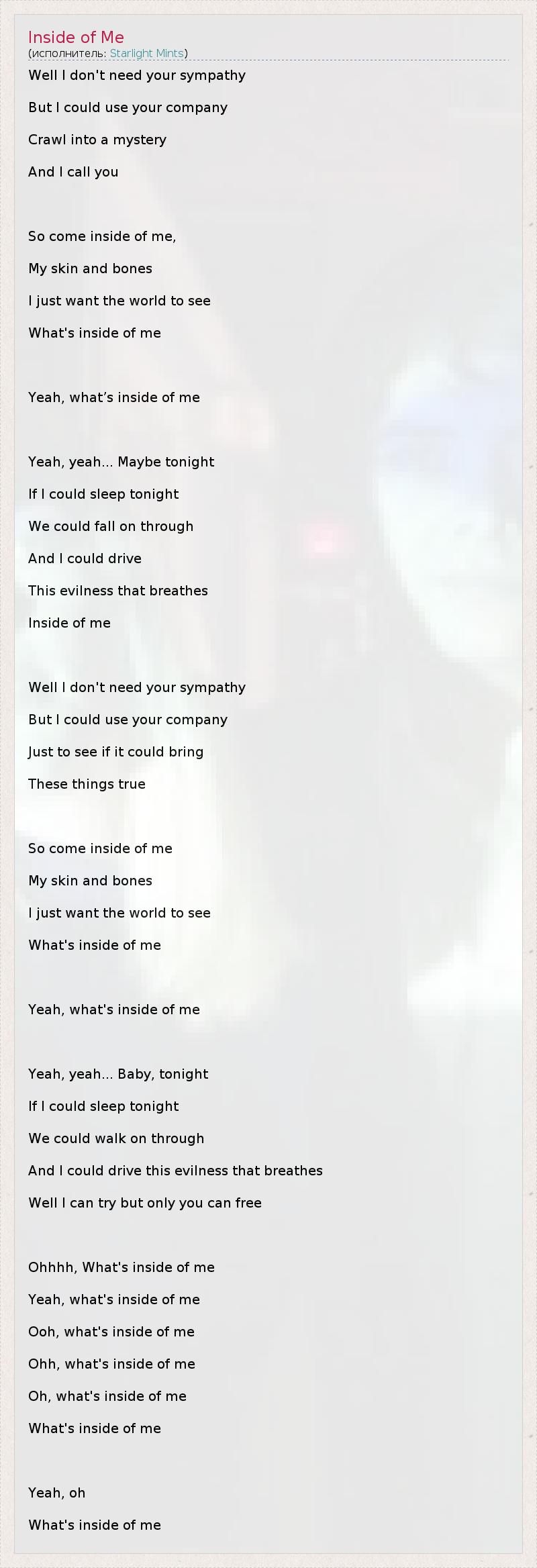 Well I don't need your sympathy But I could use your company Crawl into a mystery And I call you So come inside of me, My skin and bones I just want the world to see What's inside of me Yeah, what’s inside of me Yeah, yeah... Maybe tonight If I could sleep tonight We could fall on through And I could drive This evilness that breathes Inside of me Well I don't need your sympathy But I could use your company Just to see if it could bring These things true So come inside of me My skin and bones I just want the world to see What's inside of me Yeah, what's inside of me Yeah, yeah... Baby, tonight If I could sleep tonight We could walk on through And I could drive this evilness that breathes Well I can try but only you can free Ohhhh, What's inside of me Yeah, what's inside of me Ooh, what's inside of me Ohh, what's inside of me Oh, what's inside of me What's inside of me Yeah, oh What's inside of me