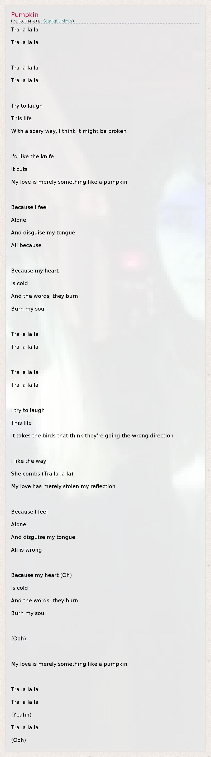 Tra la la la Tra la la la Tra la la la Tra la la la Try to laugh This life With a scary way, I think it might be broken I'd like the knife It cuts My love is merely something like a pumpkin Because I feel Alone And disguise my tongue All because Because my heart Is cold And the words, they burn Burn my soul Tra la la la Tra la la la Tra la la la Tra la la la I try to laugh This life It takes the birds that think they're going the wrong direction I like the way She combs (Tra la la la) My love has merely stolen my reflection Because I feel Alone And disguise my tongue All is wrong Because my heart (Oh) Is cold And the words, they burn Burn my soul (Ooh) My love is merely something like a pumpkin Tra la la la Tra la la la (Yeahh) Tra la la la (Ooh)