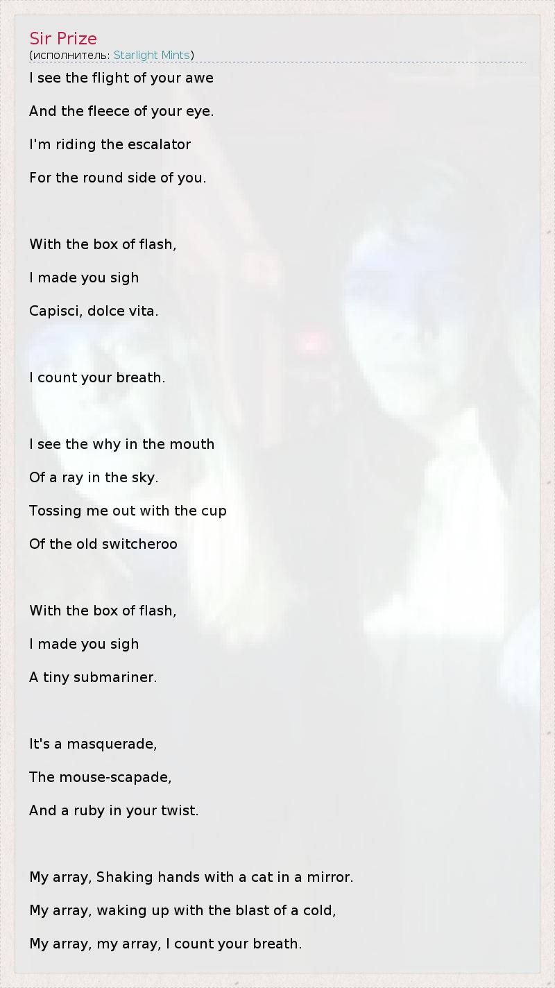 I see the flight of your awe And the fleece of your eye. I'm riding the escalator For the round side of you. With the box of flash, I made you sigh Capisci, dolce vita. I count your breath. I see the why in the mouth Of a ray in the sky. Tossing me out with the cup Of the old switcheroo With the box of flash, I made you sigh A tiny submariner. It's a masquerade, The mouse-scapade, And a ruby in your twist. My array, Shaking hands with a cat in a mirror. My array, waking up with the blast of a cold, My array, my array, l count your breath.