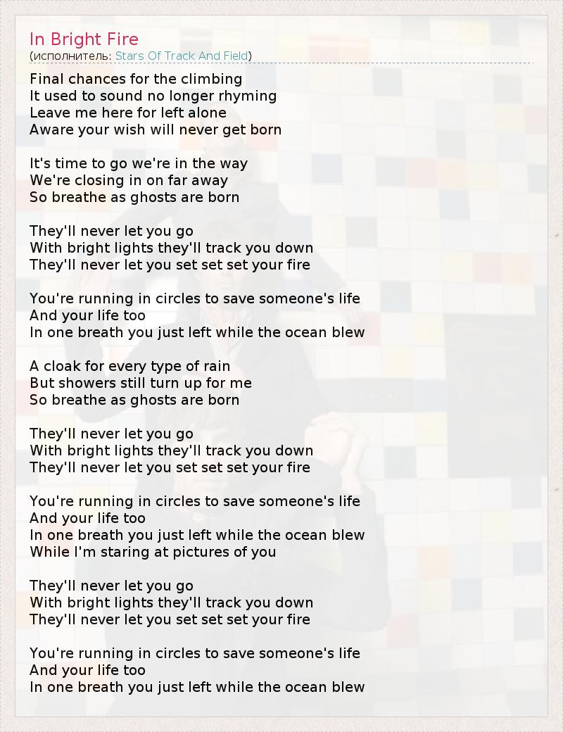 Final chances for the climbing It used to sound no longer rhyming Leave me here for left alone Aware your wish will never get born It's time to go we're in the way We're closing in on far away So breathe as ghosts are born They'll never let you go With bright lights they'll track you down They'll never let you set set set your fire You're running in circles to save someone's life And your life too In one breath you just left while the ocean blew A cloak for every type of rain But showers still turn up for me So breathe as ghosts are born They'll never let you go With bright lights they'll track you down They'll never let you set set set your fire You're running in circles to save someone's life And your life too In one breath you just left while the ocean blew While I'm staring at pictures of you They'll never let you go With bright lights they'll track you down They'll never let you set set set your fire You're running in circles to save someone's life And your life too In one breath you just left while the ocean blew