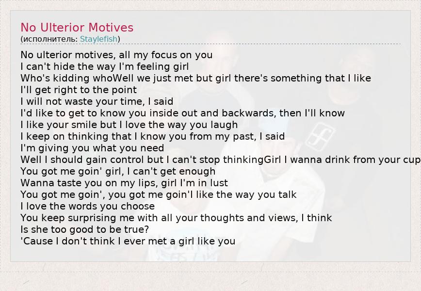 А как ты думаешь, о чем песня "No Ulterior Motives" ?