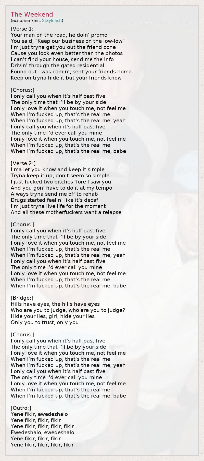 [1 куплет:] Твой парень на гастролях, он уехал в промо-тур. Ты сказала: "Пусть между нами всё остаётся в тайне". Я просто пытаюсь вырвать тебя из френд-зоны, Потому что ты выглядишь даже лучше, чем на фото. Я не могу найти твой дом, скинь мне смс-ку: Я заплутал среди жилых кварталов. Ты узнала, что я еду, ты отправила своих друзей по домам, Ты всё ещё пытаешься скрывать это, но твои друзья знают. [Припев:] Я звоню тебе только в половине шестого – Это единственное время, когда я могу быть с тобой. Я люблю, когда ты трогаешь меня, но не чувствуешь. Я настоящий, только когда я под кайфом. Да, я настоящий, только когда я под кайфом. Я звоню тебе только в половине шестого – Это единственное время, когда я называю тебя моей. Я люблю, когда ты трогаешь меня, но не чувствуешь. Я настоящий, только когда я под кайфом. Я настоящий, только когда я под кайфом, детка. [2 куплет:] Я предупреждал тебя: смотри на вещи проще. Продолжать в том же духе не так уж просто. Я тр***л двух тёлок, перед тем, как увидеть тебя, И тебе придётся жить со мной в одном темпе. Я всё время пытаюсь пройти реабилитацию. Наркотики стали похожи на кофе без кофеина. Я просто пытаюсь жить своей жизнью и ловить момент, А все эти за***нцы хотят, чтобы я сорвался. [Припев:] Я звоню тебе только в половине шестого – Это единственное время, когда я могу быть с тобой. Я люблю, когда ты трогаешь меня, но не чувствуешь. Я настоящий, только когда я под кайфом. Да, я настоящий, только когда я под кайфом. Я звоню тебе только в половине шестого – Это единственное время, когда я называю тебя моей. Я люблю, когда ты трогаешь меня, но не чувствуешь. Я настоящий, только когда я под кайфом. Я настоящий, только когда я под кайфом, детка. [Переход:] У холмов есть глаза, 1 у холмов есть глаза. Кто вы такие, чтобы судить? Кто вы такие, чтобы судить? Скрывай свою ложь, девочка, скрывай свою ложь. Я верю только тебе, только тебе. [Припев:] Я звоню тебе только в половине шестого – Это единственное время, когда я могу быть с тобой. Я люблю, когда ты трогаешь меня, но не чувствуешь. Я настоящий, только когда я под кайфом. Да, я настоящий, только когда я под кайфом. Я звоню тебе только в половине шестого – Это единственное время, когда я называю тебя моей. Я люблю, когда ты трогаешь меня, но не чувствуешь. Я настоящий, только когда я под кайфом. Я настоящий, только когда я под кайфом, детка. [Окончание:] 2 Любовь моя, я очень люблю тебя, Любовь моя, любовь моя, Любовь моя, любовь моя, любовь моя. Я очень люблю тебя, я очень люблю тебя. Любовь моя, любовь моя, Любовь моя, любовь моя, любовь моя. * – Имеются в виду Голливудские холмы. 1 – "У холмов есть глаза" (The Hills Have Eyes) – культовый американский фильм ужасов Уэса Крейвена 1977 года. 2 – Перевод с амхарского языка – родного языка The Weeknd.