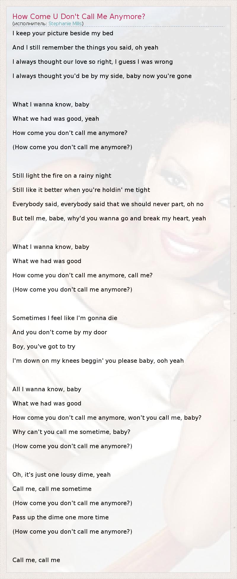 I keep your picture beside my bed And I still remember the things you said, oh yeah I always thought our love so right, I guess I was wrong I always thought you'd be by my side, baby now you're gone What I wanna know, baby What we had was good, yeah How come you don't call me anymore? (How come you don't call me anymore?) Still light the fire on a rainy night Still like it better when you're holdin' me tight Everybody said, everybody said that we should never part, oh no But tell me, babe, why'd you wanna go and break my heart, yeah What I wanna know, baby What we had was good How come you don't call me anymore, call me? (How come you don't call me anymore?) Sometimes I feel like I'm gonna die And you don't come by my door Boy, you've got to try I'm down on my knees beggin' you please baby, ooh yeah All I wanna know, baby What we had was good How come you don't call me anymore, won't you call me, baby? Why can't you call me sometime, baby? (How come you don't call me anymore?) Oh, it's just one lousy dime, yeah Call me, call me sometime (How come you don't call me anymore?) Pass up the dime one more time (How come you don't call me anymore?) Call me, call me