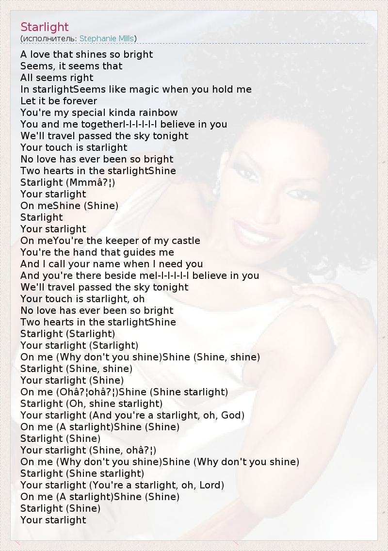 A love that shines so bright Seems, it seems that All seems right In starlightSeems like magic when you hold me Let it be forever You're my special kinda rainbow You and me togetherI-I-I-I-I-I believe in you We'll travel passed the sky tonight Your touch is starlight No love has ever been so bright Two hearts in the starlightShine Starlight (Mmmâ?¦) Your starlight On meShine (Shine) Starlight Your starlight On meYou're the keeper of my castle You're the hand that guides me And I call your name when I need you And you're there beside meI-I-I-I-I-I believe in you We'll travel passed the sky tonight Your touch is starlight, oh No love has ever been so bright Two hearts in the starlightShine Starlight (Starlight) Your starlight (Starlight) On me (Why don't you shine)Shine (Shine, shine) Starlight (Shine, shine) Your starlight (Shine) On me (Ohâ?¦ohâ?¦)Shine (Shine starlight) Starlight (Oh, shine starlight) Your starlight (And you're a starlight, oh, God) On me (A starlight)Shine (Shine) Starlight (Shine) Your starlight (Shine, ohâ?¦) On me (Why don't you shine)Shine (Why don't you shine) Starlight (Shine starlight) Your starlight (You're a starlight, oh, Lord) On me (A starlight)Shine (Shine) Starlight (Shine) Your starlight