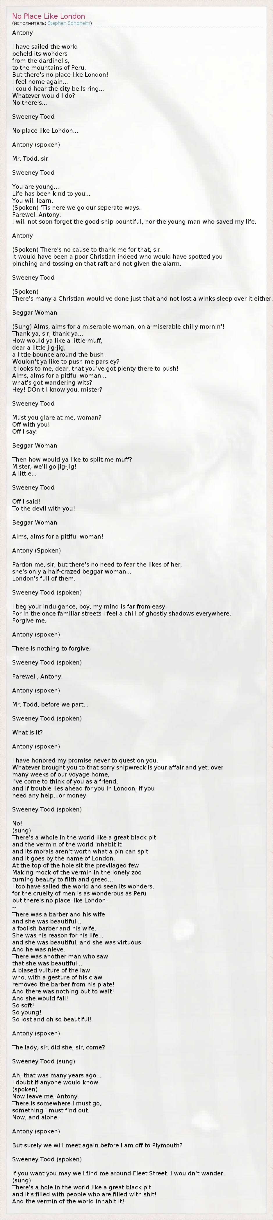 Antony I have sailed the world beheld its wonders from the dardinells, to the mountains of Peru, But there's no place like London! I feel home again... I could hear the city bells ring... Whatever would I do? No there's... Sweeney Todd No place like London... Antony (spoken) Mr. Todd, sir Sweeney Todd You are young... Life has been kind to you... You will learn. (Spoken) 'Tis here we go our seperate ways. Farewell Antony. I will not soon forget the good ship bountiful, nor the young man who saved my life. Antony (Spoken) There's no cause to thank me for that, sir. It would have been a poor Christian indeed who would have spotted you pinching and tossing on that raft and not given the alarm. Sweeney Todd (Spoken) There's many a Christian would've done just that and not lost a winks sleep over it either. Beggar Woman (Sung) Alms, alms for a miserable woman, on a miserable chilly mornin'! Thank ya, sir, thank ya... How would ya like a little muff, dear a little jig-jig, a little bounce around the bush! Wouldn't ya like to push me parsley? It looks to me, dear, that you've got plenty there to push! Alms, alms for a pitiful woman... what's got wandering wits? Hey! DOn't I know you, mister? Sweeney Todd Must you glare at me, woman? Off with you! Off I say! Beggar Woman Then how would ya like to split me muff? Mister, we'll go jig-jig! A little... Sweeney Todd Off I said! To the devil with you! Beggar Woman Alms, alms for a pitiful woman! Antony (Spoken) Pardon me, sir, but there's no need to fear the likes of her, she's only a half-crazed beggar woman... London's full of them. Sweeney Todd (spoken) I beg your indulgance, boy, my mind is far from easy. For in the once familiar streets I feel a chill of ghostly shadows everywhere. Forgive me. Antony (spoken) There is nothing to forgive. Sweeney Todd (spoken) Farewell, Antony. Antony (spoken) Mr. Todd, before we part... Sweeney Todd (spoken) What is it? Antony (spoken) I have honored my promise never to question you. Whatever brought you to that sorry shipwreck is your affair and yet, over many weeks of our voyage home, I've come to think of you as a friend, and if trouble lies ahead for you in London, if you need any help...or money. Sweeney Todd (spoken) No! (sung) There's a whole in the world like a great black pit and the vermin of the world inhabit it and its morals aren't worth what a pin can spit and it goes by the name of London. At the top of the hole sit the previlaged few Making mock of the vermin in the lonely zoo turning beauty to filth and greed... I too have sailed the world and seen its wonders, for the cruelty of men is as wonderous as Peru but there's no place like London! -- There was a barber and his wife and she was beautiful... a foolish barber and his wife. She was his reason for his life... and she was beautiful, and she was virtuous. And he was nieve. There was another man who saw that she was beautiful... A biased vulture of the law who, with a gesture of his claw removed the barber from his plate! And there was nothing but to wait! And she would fall! So soft! So young! So lost and oh so beautiful! Antony (spoken) The lady, sir, did she, sir, come? Sweeney Todd (sung) Ah, that was many years ago... I doubt if anyone would know. (spoken) Now leave me, Antony. There is somewhere I must go, something i must find out. Now, and alone. Antony (spoken) But surely we will meet again before I am off to Plymouth? Sweeney Todd (spoken) If you want you may well find me around Fleet Street. I wouldn't wander. (sung) There's a hole in the world like a great black pit and it's filled with people who are filled with shit! And the vermin of the world inhabit it!