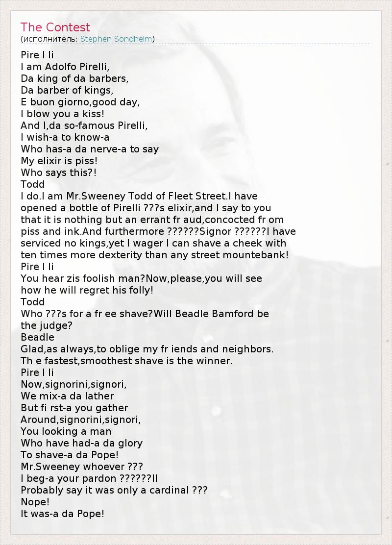 Pire l li I am Adolfo Pirelli, Da king of da barbers, Da barber of kings, E buon giorno,good day, I blow you a kiss! And I,da so-famous Pirelli, I wish-a to know-a Who has-a da nerve-a to say My elixir is piss! Who says this?! Todd I do.I am Mr.Sweeney Todd of Fleet Street.I have opened a bottle of Pirelli ???s elixir,and I say to you that it is nothing but an errant fr aud,concocted fr om piss and ink.And furthermore ??????Signor ??????I have serviced no kings,yet I wager I can shave a cheek with ten times more dexterity than any street mountebank! Pire l li You hear zis foolish man?Now,please,you will see how he will regret his folly! Todd Who ???s for a fr ee shave?Will Beadle Bamford be the judge? Beadle Glad,as always,to oblige my fr iends and neighbors. Th e fastest,smoothest shave is the winner. Pire l li Now,signorini,signori, We mix-a da lather But fi rst-a you gather Around,signorini,signori, You looking a man Who have had-a da glory To shave-a da Pope! Mr.Sweeney whoever ??? I beg-a your pardon ??????ll Probably say it was only a cardinal ??? Nope! It was-a da Pope!