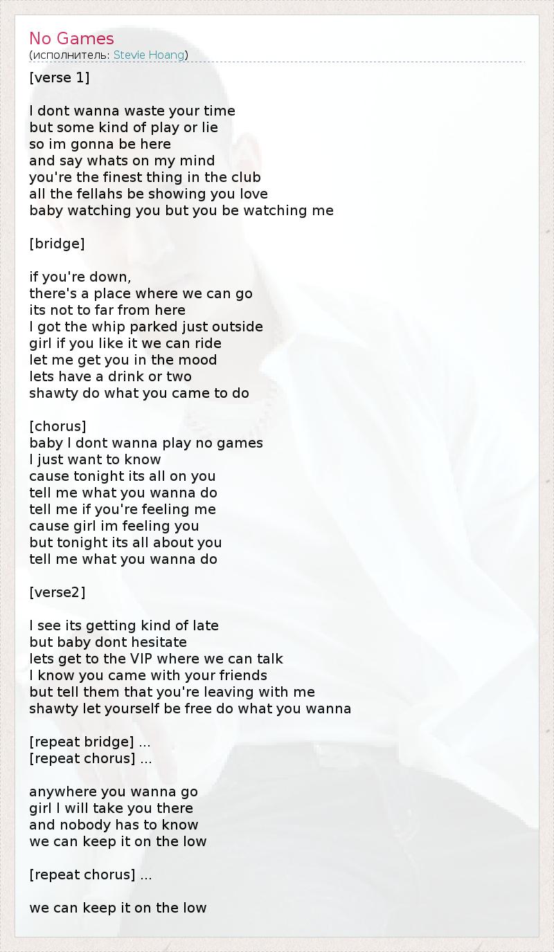 [verse 1] I dont wanna waste your time but some kind of play or lie so im gonna be here and say whats on my mind you're the finest thing in the club all the fellahs be showing you love baby watching you but you be watching me [bridge] if you're down, there's a place where we can go its not to far from here I got the whip parked just outside girl if you like it we can ride let me get you in the mood lets have a drink or two shawty do what you came to do [chorus] baby I dont wanna play no games I just want to know cause tonight its all on you tell me what you wanna do tell me if you're feeling me cause girl im feeling you but tonight its all about you tell me what you wanna do [verse2] I see its getting kind of late but baby dont hesitate lets get to the VIP where we can talk I know you came with your friends but tell them that you're leaving with me shawty let yourself be free do what you wanna [repeat bridge] ... [repeat chorus] ... anywhere you wanna go girl I will take you there and nobody has to know we can keep it on the low [repeat chorus] ... we can keep it on the low