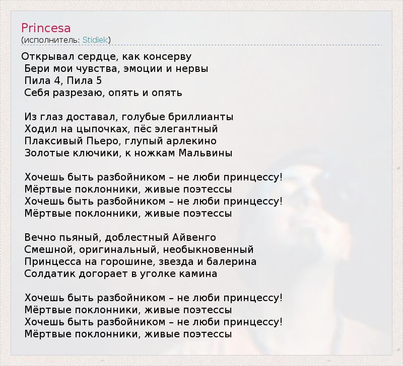 Открывал сердце, как консерву Бери мои чувства, эмоции и нервы Пила 4, Пила 5 Себя разрезаю, опять и опять Из глаз доставал, голубые бриллианты Ходил на цыпочках, пёс элегантный Плаксивый Пьеро, глупый арлекино Золотые ключики, к ножкам Мальвины Хочешь быть разбойником – не люби принцессу! Мёртвые поклонники, живые поэтессы Хочешь быть разбойником – не люби принцессу! Мёртвые поклонники, живые поэтессы Вечно пьяный, доблестный Айвенго Смешной, оригинальный, необыкновенный Принцесса на горошине, звезда и балерина Солдатик догорает в уголке камина Хочешь быть разбойником – не люби принцессу! Мёртвые поклонники, живые поэтессы Хочешь быть разбойником – не люби принцессу! Мёртвые поклонники, живые поэтессы