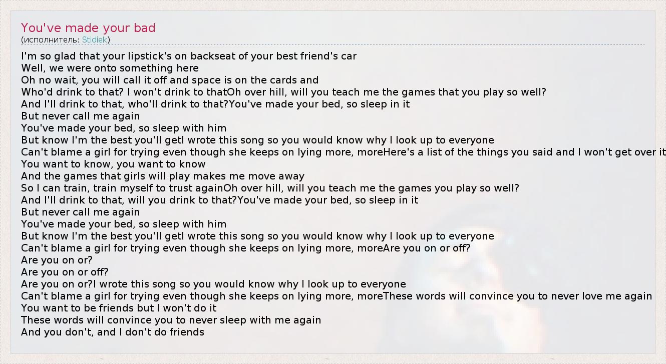 I'm so glad that your lipstick's on backseat of your best friend's car Well, we were onto something here Oh no wait, you will call it off and space is on the cards and Who'd drink to that? I won't drink to thatOh over hill, will you teach me the games that you play so well? And I'll drink to that, who'll drink to that?You've made your bed, so sleep in it But never call me again You've made your bed, so sleep with him But know I'm the best you'll getI wrote this song so you would know why I look up to everyone Can't blame a girl for trying even though she keeps on lying more, moreHere's a list of the things you said and I won't get over it You want to know, you want to know And the games that girls will play makes me move away So I can train, train myself to trust againOh over hill, will you teach me the games you play so well? And I'll drink to that, will you drink to that?You've made your bed, so sleep in it But never call me again You've made your bed, so sleep with him But know I'm the best you'll getI wrote this song so you would know why I look up to everyone Can't blame a girl for trying even though she keeps on lying more, moreAre you on or off? Are you on or? Are you on or off? Are you on or?I wrote this song so you would know why I look up to everyone Can't blame a girl for trying even though she keeps on lying more, moreThese words will convince you to never love me again You want to be friends but I won't do it These words will convince you to never sleep with me again And you don't, and I don't do friends