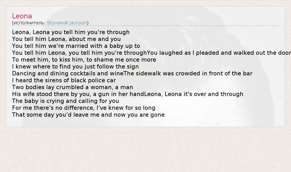 You tell him Leona, you tell him you're throughYou laughed as I pleaded and walked out the door