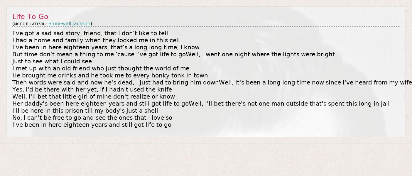 I've got a sad sad story, friend, that I don't like to tell I had a home and family when they locked me in this cell I've been in here eighteen years, that's a long long time, I know But time don't mean a thing to me 'cause I've got life to goWell, I went one night where the lights were bright Just to see what I could see I met up with an old friend who just thought the world of me He brought me drinks and he took me to every honky tonk in town Then words were said and now he's dead, I just had to bring him downWell, it's been a long long time now since I've heard from my wife Yes, I'd be there with her yet, if I hadn't used the knife Well, I'll bet that little girl of mine don't realize or know Her daddy's been here eighteen years and still got life to goWell, I'll bet there's not one man outside that's spent this long in jail I'll be here in this prison till my body's just a shell No, I can't be free to go and see the ones that I love so I've been in here eighteen years and still got life to go