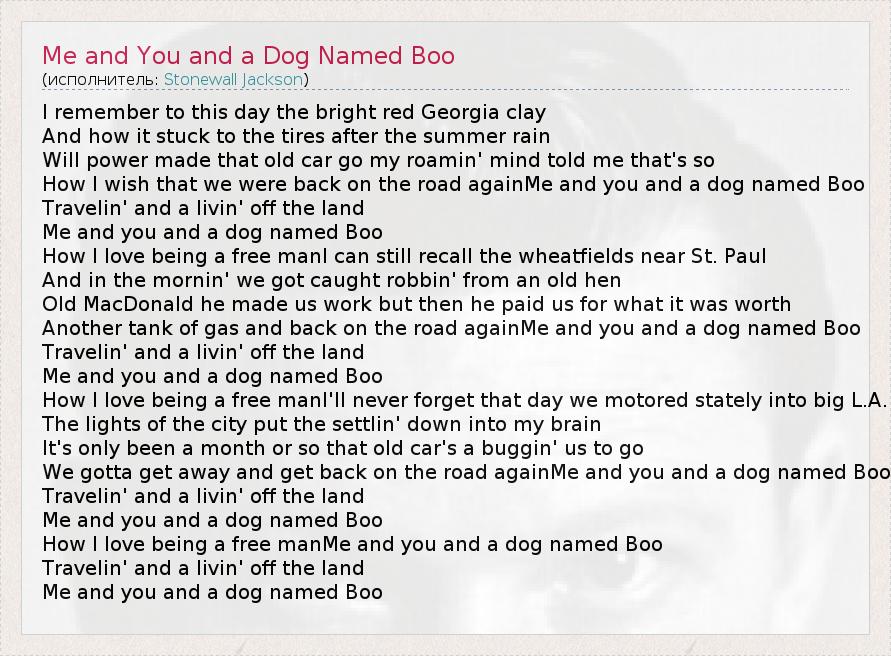 I remember to this day the bright red Georgia clay And how it stuck to the tires after the summer rain Will power made that old car go my roamin' mind told me that's so How I wish that we were back on the road againMe and you and a dog named Boo Travelin' and a livin' off the land Me and you and a dog named Boo How I love being a free manI can still recall the wheatfields near St. Paul And in the mornin' we got caught robbin' from an old hen Old MacDonald he made us work but then he paid us for what it was worth Another tank of gas and back on the road againMe and you and a dog named Boo Travelin' and a livin' off the land Me and you and a dog named Boo How I love being a free manI'll never forget that day we motored stately into big L.A. The lights of the city put the settlin' down into my brain It's only been a month or so that old car's a buggin' us to go We gotta get away and get back on the road againMe and you and a dog named Boo Travelin' and a livin' off the land Me and you and a dog named Boo How I love being a free manMe and you and a dog named Boo Travelin' and a livin' off the land Me and you and a dog named Boo