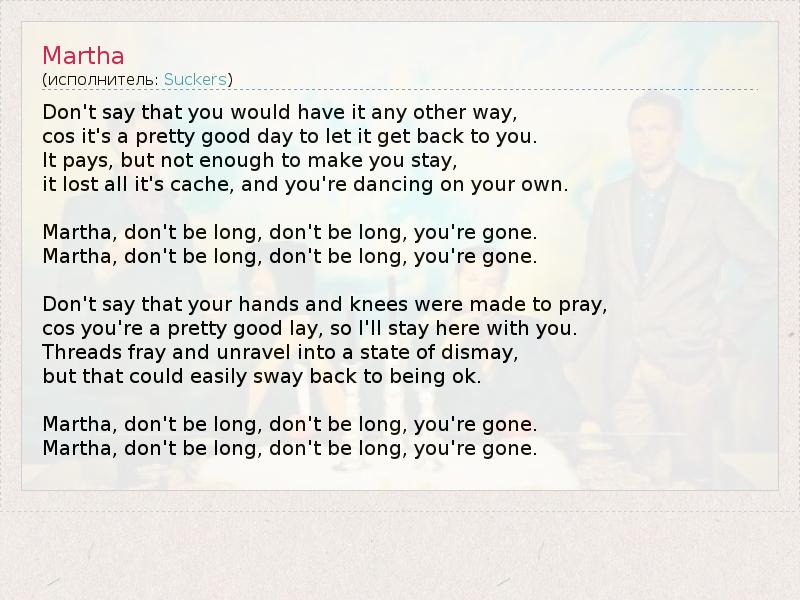 Don't say that you would have it any other way, cos it's a pretty good day to let it get back to you. It pays, but not enough to make you stay, it lost all it's cache, and you're dancing on your own. Martha, don't be long, don't be long, you're gone. Martha, don't be long, don't be long, you're gone. Don't say that your hands and knees were made to pray, cos you're a pretty good lay, so I'll stay here with you. Threads fray and unravel into a state of dismay, but that could easily sway back to being ok. Martha, don't be long, don't be long, you're gone. Martha, don't be long, don't be long, you're gone.