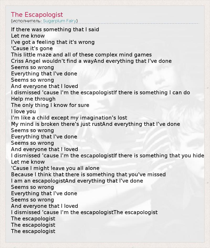 If there was something that I said Let me know I've got a feeling that it's wrong 'Cause it's gone This little maze and all of these complex mind games Criss Angel wouldn't find a wayAnd everything that I've done Seems so wrong Everything that I've done Seems so wrong And everyone that I loved I dismissed 'cause I'm the escapologistIf there is something I can do Help me through The only thing I know for sure I love you I'm like a child except my imagination's lost My mind is broken there's just rustAnd everything that I've done Seems so wrong Everything that I've done Seems so wrong And everyone that I loved I dismissed 'cause I'm the escapologistIf there is something that you hide Let me know 'Cause I might leave you all alone Because I think that there is something that you've missed I am an escapologistAnd everything that I've done Seems so wrong Everything that I've done Seems so wrong And everyone that I loved I dismissed 'cause I'm the escapologistThe escapologist The escapologist The escapologist The escapologist
