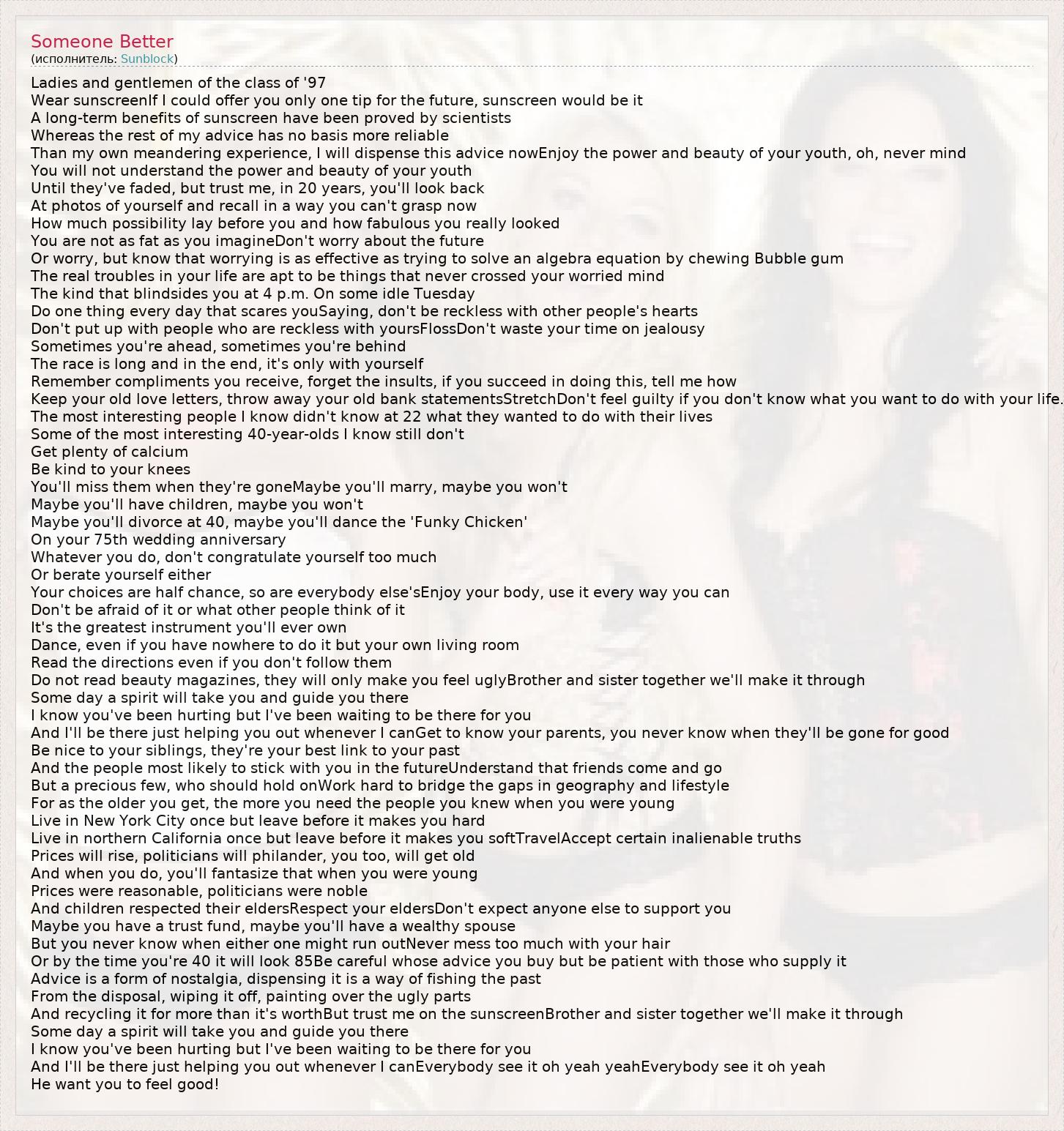 Ladies and gentlemen of the class of '97 Wear sunscreenIf I could offer you only one tip for the future, sunscreen would be it A long-term benefits of sunscreen have been proved by scientists Whereas the rest of my advice has no basis more reliable Than my own meandering experience, I will dispense this advice nowEnjoy the power and beauty of your youth, oh, never mind You will not understand the power and beauty of your youth Until they've faded, but trust me, in 20 years, you'll look back At photos of yourself and recall in a way you can't grasp now How much possibility lay before you and how fabulous you really looked You are not as fat as you imagineDon't worry about the future Or worry, but know that worrying is as effective as trying to solve an algebra equation by chewing Bubble gum The real troubles in your life are apt to be things that never crossed your worried mind The kind that blindsides you at 4 p.m. On some idle Tuesday Do one thing every day that scares youSaying, don't be reckless with other people's hearts Don't put up with people who are reckless with yoursFlossDon't waste your time on jealousy Sometimes you're ahead, sometimes you're behind The race is long and in the end, it's only with yourself Remember compliments you receive, forget the insults, if you succeed in doing this, tell me how Keep your old love letters, throw away your old bank statementsStretchDon't feel guilty if you don't know what you want to do with your life. The most interesting people I know didn't know at 22 what they wanted to do with their lives Some of the most interesting 40-year-olds I know still don't Get plenty of calcium Be kind to your knees You'll miss them when they're goneMaybe you'll marry, maybe you won't Maybe you'll have children, maybe you won't Maybe you'll divorce at 40, maybe you'll dance the 'Funky Chicken' On your 75th wedding anniversary Whatever you do, don't congratulate yourself too much Or berate yourself either Your choices are half chance, so are everybody else'sEnjoy your body, use it every way you can Don't be afraid of it or what other people think of it It's the greatest instrument you'll ever own Dance, even if you have nowhere to do it but your own living room Read the directions even if you don't follow them Do not read beauty magazines, they will only make you feel uglyBrother and sister together we'll make it through Some day a spirit will take you and guide you there I know you've been hurting but I've been waiting to be there for you And I'll be there just helping you out whenever I canGet to know your parents, you never know when they'll be gone for good Be nice to your siblings, they're your best link to your past And the people most likely to stick with you in the futureUnderstand that friends come and go But a precious few, who should hold onWork hard to bridge the gaps in geography and lifestyle For as the older you get, the more you need the people you knew when you were young Live in New York City once but leave before it makes you hard Live in northern California once but leave before it makes you softTravelAccept certain inalienable truths Prices will rise, politicians will philander, you too, will get old And when you do, you'll fantasize that when you were young Prices were reasonable, politicians were noble And children respected their eldersRespect your eldersDon't expect anyone else to support you Maybe you have a trust fund, maybe you'll have a wealthy spouse But you never know when either one might run outNever mess too much with your hair Or by the time you're 40 it will look 85Be careful whose advice you buy but be patient with those who supply it Advice is a form of nostalgia, dispensing it is a way of fishing the past From the disposal, wiping it off, painting over the ugly parts And recycling it for more than it's worthBut trust me on the sunscreenBrother and sister together we'll make it through Some day a spirit will take you and guide you there I know you've been hurting but I've been waiting to be there for you And I'll be there just helping you out whenever I canEverybody see it oh yeah yeahEverybody see it oh yeah He want you to feel good!