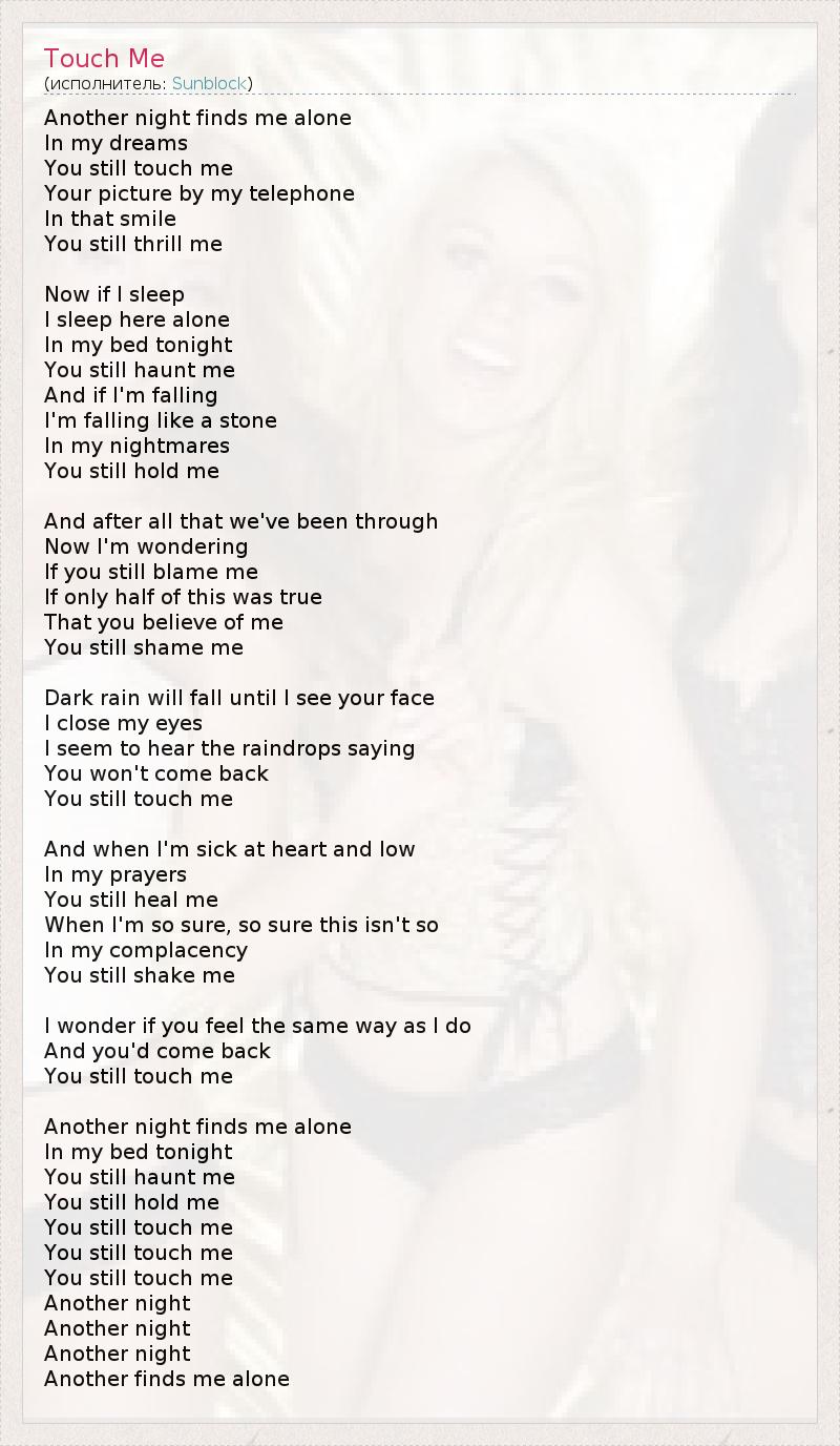 Another night finds me alone In my dreams You still touch me Your picture by my telephone In that smile You still thrill me Now if I sleep I sleep here alone In my bed tonight You still haunt me And if I'm falling I'm falling like a stone In my nightmares You still hold me And after all that we've been through Now I'm wondering If you still blame me If only half of this was true That you believe of me You still shame me Dark rain will fall until I see your face I close my eyes I seem to hear the raindrops saying You won't come back You still touch me And when I'm sick at heart and low In my prayers You still heal me When I'm so sure, so sure this isn't so In my complacency You still shake me I wonder if you feel the same way as I do And you'd come back You still touch me Another night finds me alone In my bed tonight You still haunt me You still hold me You still touch me You still touch me You still touch me Another night Another night Another night Another finds me alone