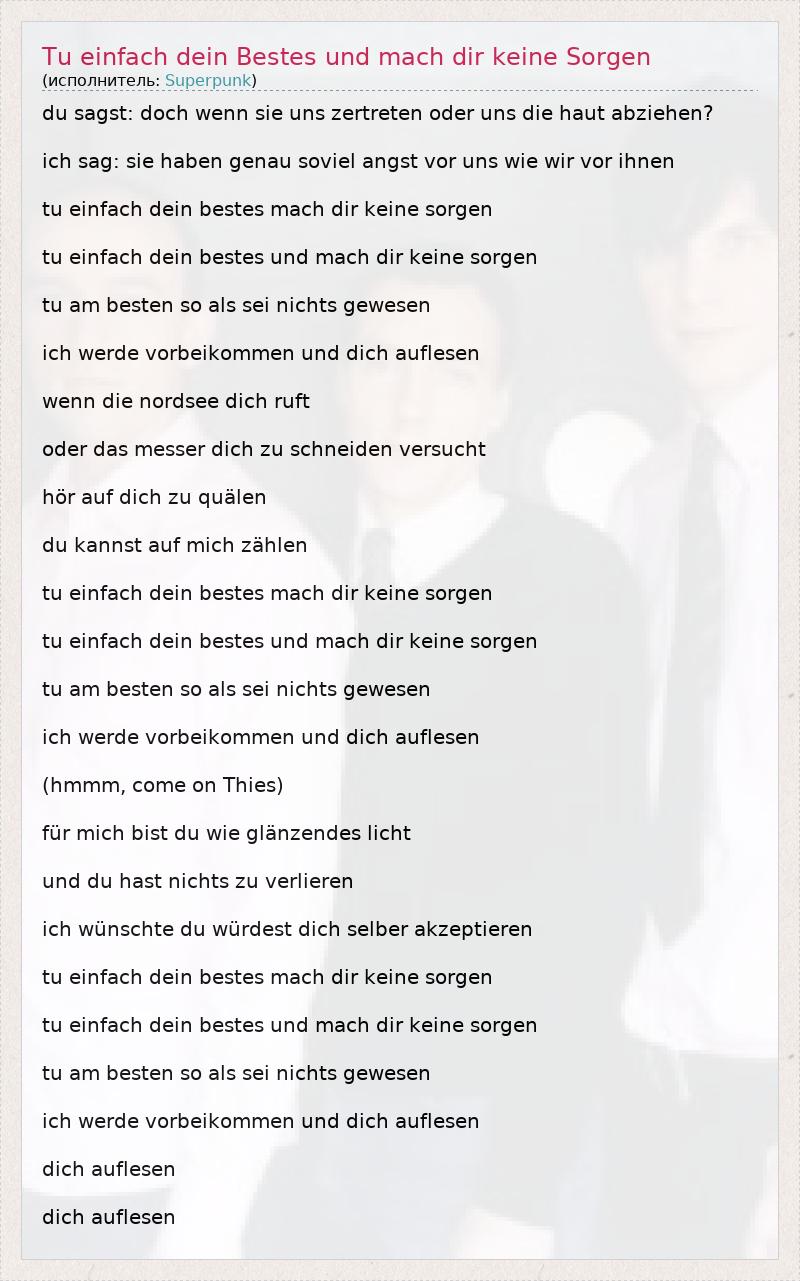 du sagst: doch wenn sie uns zertreten oder uns die haut abziehen? ich sag: sie haben genau soviel angst vor uns wie wir vor ihnen tu einfach dein bestes mach dir keine sorgen tu einfach dein bestes und mach dir keine sorgen tu am besten so als sei nichts gewesen ich werde vorbeikommen und dich auflesen wenn die nordsee dich ruft oder das messer dich zu schneiden versucht hör auf dich zu quälen du kannst auf mich zählen tu einfach dein bestes mach dir keine sorgen tu einfach dein bestes und mach dir keine sorgen tu am besten so als sei nichts gewesen ich werde vorbeikommen und dich auflesen (hmmm, come on Thies) für mich bist du wie glänzendes licht und du hast nichts zu verlieren ich wünschte du würdest dich selber akzeptieren tu einfach dein bestes mach dir keine sorgen tu einfach dein bestes und mach dir keine sorgen tu am besten so als sei nichts gewesen ich werde vorbeikommen und dich auflesen dich auflesen dich auflesen
