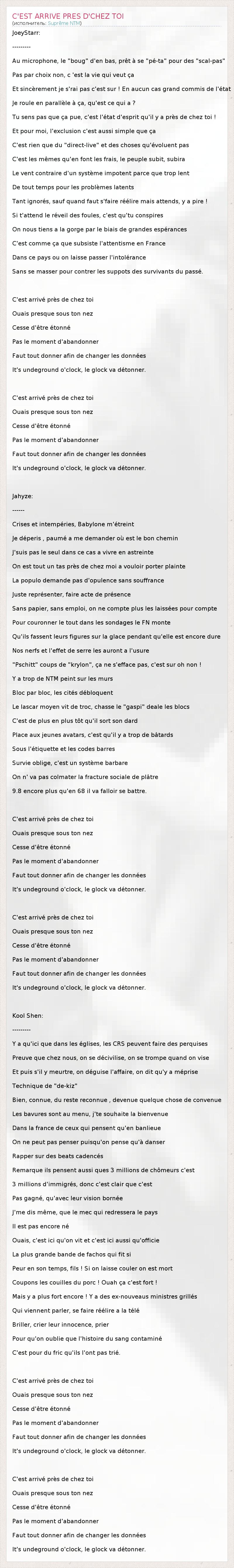 JoeyStarr: --------- Au microphone, le "boug" d'en bas, prêt à se "pé-ta" pour des "scal-pas" Pas par choix non, c 'est la vie qui veut ça Et sincèrement je s'rai pas c'est sur ! En aucun cas grand commis de l'état Je roule en parallèle à ça, qu'est ce qui a ? Tu sens pas que ça pue, c'est l'état d'esprit qu'il y a près de chez toi ! Et pour moi, l'exclusion c'est aussi simple que ça C'est rien que du "direct-live" et des choses qu'évoluent pas C'est les mêmes qu'en font les frais, le peuple subit, subira Le vent contraire d'un système impotent parce que trop lent De tout temps pour les problèmes latents Tant ignorés, sauf quand faut s'faire réélire mais attends, y a pire ! Si t'attend le réveil des foules, c'est qu'tu conspires On nous tiens a la gorge par le biais de grandes espérances C'est comme ça que subsiste l'attentisme en France Dans ce pays ou on laisse passer l'intolérance Sans se masser pour contrer les suppots des survivants du passé. C'est arrivé près de chez toi Ouais presque sous ton nez Cesse d'être étonné Pas le moment d'abandonner Faut tout donner afin de changer les données It's undeground o'clock, le glock va détonner. C'est arrivé près de chez toi Ouais presque sous ton nez Cesse d'être étonné Pas le moment d'abandonner Faut tout donner afin de changer les données It's undeground o'clock, le glock va détonner. Jahyze: ------ Crises et intempéries, Babylone m'étreint Je déperis , paumé a me demander où est le bon chemin J'suis pas le seul dans ce cas a vivre en astreinte On est tout un tas près de chez moi a vouloir porter plainte La populo demande pas d'opulence sans souffrance Juste représenter, faire acte de présence Sans papier, sans emploi, on ne compte plus les laissées pour compte Pour couronner le tout dans les sondages le FN monte Qu'ils fassent leurs figures sur la glace pendant qu'elle est encore dure Nos nerfs et l'effet de serre les auront a l'usure "Pschitt" coups de "krylon", ça ne s'efface pas, c'est sur oh non ! Y a trop de NTM peint sur les murs Bloc par bloc, les cités débloquent Le lascar moyen vit de troc, chasse le "gaspi" deale les blocs C'est de plus en plus tôt qu'il sort son dard Place aux jeunes avatars, c'est qu'il y a trop de bâtards Sous l'étiquette et les codes barres Survie oblige, c'est un système barbare On n' va pas colmater la fracture sociale de plâtre 9.8 encore plus qu'en 68 il va falloir se battre. C'est arrivé près de chez toi Ouais presque sous ton nez Cesse d'être étonné Pas le moment d'abandonner Faut tout donner afin de changer les données It's undeground o'clock, le glock va détonner. C'est arrivé près de chez toi Ouais presque sous ton nez Cesse d'être étonné Pas le moment d'abandonner Faut tout donner afin de changer les données It's undeground o'clock, le glock va détonner. Kool Shen: --------- Y a qu'ici que dans les églises, les CRS peuvent faire des perquises Preuve que chez nous, on se décivilise, on se trompe quand on vise Et puis s'il y meurtre, on déguise l'affaire, on dit qu'y a méprise Technique de "de-kiz" Bien, connue, du reste reconnue , devenue quelque chose de convenue Les bavures sont au menu, j'te souhaite la bienvenue Dans la france de ceux qui pensent qu'en banlieue On ne peut pas penser puisqu'on pense qu'à danser Rapper sur des beats cadencés Remarque ils pensent aussi ques 3 millions de chômeurs c'est 3 millions d'immigrés, donc c'est clair que c'est Pas gagné, qu'avec leur vision bornée J'me dis même, que le mec qui redressera le pays Il est pas encore né Ouais, c'est ici qu'on vit et c'est ici aussi qu'officie La plus grande bande de fachos qui fit si Peur en son temps, fils ! Si on laisse couler on est mort Coupons les couilles du porc ! Ouah ça c'est fort ! Mais y a plus fort encore ! Y a des ex-nouveaus ministres grillés Qui viennent parler, se faire réélire a la télé Briller, crier leur innocence, prier Pour qu'on oublie que l'histoire du sang contaminé C'est pour du fric qu'ils l'ont pas trié. C'est arrivé près de chez toi Ouais presque sous ton nez Cesse d'être étonné Pas le moment d'abandonner Faut tout donner afin de changer les données It's undeground o'clock, le glock va détonner. C'est arrivé près de chez toi Ouais presque sous ton nez Cesse d'être étonné Pas le moment d'abandonner Faut tout donner afin de changer les données It's undeground o'clock, le glock va détonner.