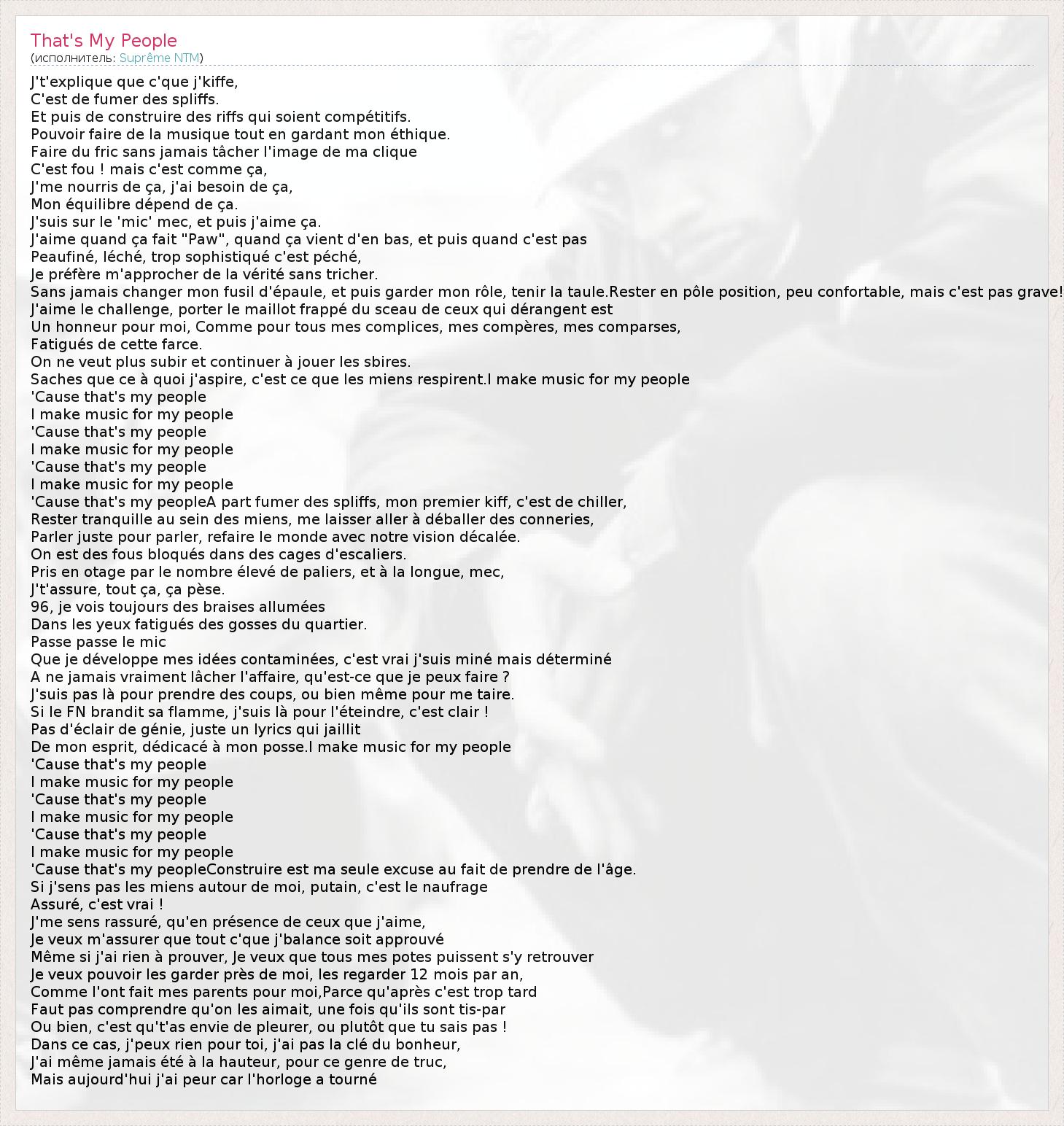 J't'explique que c'que j'kiffe, C'est de fumer des spliffs. Et puis de construire des riffs qui soient compétitifs. Pouvoir faire de la musique tout en gardant mon éthique. Faire du fric sans jamais tâcher l'image de ma clique C'est fou ! mais c'est comme ça, J'me nourris de ça, j'ai besoin de ça, Mon équilibre dépend de ça. J'suis sur le 'mic' mec, et puis j'aime ça. J'aime quand ça fait "Paw", quand ça vient d'en bas, et puis quand c'est pas Peaufiné, léché, trop sophistiqué c'est péché, Je préfère m'approcher de la vérité sans tricher. Sans jamais changer mon fusil d'épaule, et puis garder mon rôle, tenir la taule.Rester en pôle position, peu confortable, mais c'est pas grave! J'aime le challenge, porter le maillot frappé du sceau de ceux qui dérangent est Un honneur pour moi, Comme pour tous mes complices, mes compères, mes comparses, Fatigués de cette farce. On ne veut plus subir et continuer à jouer les sbires. Saches que ce à quoi j'aspire, c'est ce que les miens respirent.I make music for my people 'Cause that's my people I make music for my people 'Cause that's my people I make music for my people 'Cause that's my people I make music for my people 'Cause that's my peopleA part fumer des spliffs, mon premier kiff, c'est de chiller, Rester tranquille au sein des miens, me laisser aller à déballer des conneries, Parler juste pour parler, refaire le monde avec notre vision décalée. On est des fous bloqués dans des cages d'escaliers. Pris en otage par le nombre élevé de paliers, et à la longue, mec, J't'assure, tout ça, ça pèse. 96, je vois toujours des braises allumées Dans les yeux fatigués des gosses du quartier. Passe passe le mic Que je développe mes idées contaminées, c'est vrai j'suis miné mais déterminé A ne jamais vraiment lâcher l'affaire, qu'est-ce que je peux faire ? J'suis pas là pour prendre des coups, ou bien même pour me taire. Si le FN brandit sa flamme, j'suis là pour l'éteindre, c'est clair ! Pas d'éclair de génie, juste un lyrics qui jaillit De mon esprit, dédicacé à mon posse.I make music for my people 'Cause that's my people I make music for my people 'Cause that's my people I make music for my people 'Cause that's my people I make music for my people 'Cause that's my peopleConstruire est ma seule excuse au fait de prendre de l'âge. Si j'sens pas les miens autour de moi, putain, c'est le naufrage Assuré, c'est vrai ! J'me sens rassuré, qu'en présence de ceux que j'aime, Je veux m'assurer que tout c'que j'balance soit approuvé Même si j'ai rien à prouver, Je veux que tous mes potes puissent s'y retrouver Je veux pouvoir les garder près de moi, les regarder 12 mois par an, Comme l'ont fait mes parents pour moi,Parce qu'après c'est trop tard Faut pas comprendre qu'on les aimait, une fois qu'ils sont tis-par Ou bien, c'est qu't'as envie de pleurer, ou plutôt que tu sais pas ! Dans ce cas, j'peux rien pour toi, j'ai pas la clé du bonheur, J'ai même jamais été à la hauteur, pour ce genre de truc, Mais aujourd'hui j'ai peur car l'horloge a tourné