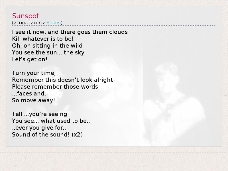 I see it now, and there goes them clouds Kill whatever is to be! Oh, oh sitting in the wild You see the sun... the sky Let's get on! Turn your time, Remember this doesn't look alright! Please remember those words ...faces and.. So move away! Tell ...you're seeing You see... what used to be... ..ever you give for... Sound of the sound! (x2)