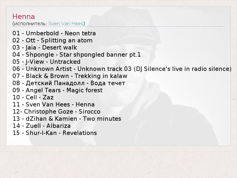 01 - Umberbold - Neon tetra 02 - Ott - Splitting an atom 03 - Jaia - Desert walk 04 - Shpongle - Star shpongled banner pt.1 05 - J-View - Untracked 06 - Unknown Artist - Unknown track 03 (DJ Silence's live in radio silence) 07 - Black & Brown - Trekking in kalaw 08 - Детский Панадолл - Вода течет 09 - Angel Tears - Magic forest 10 - Cell - Zaz 11 - Sven Van Hees - Henna 12- Christophe Goze - Sirocco 13 - dZihan & Kamien - Two minutes 14 - Zuell - Albariza 15 - Shur-I-Kan - Revelations