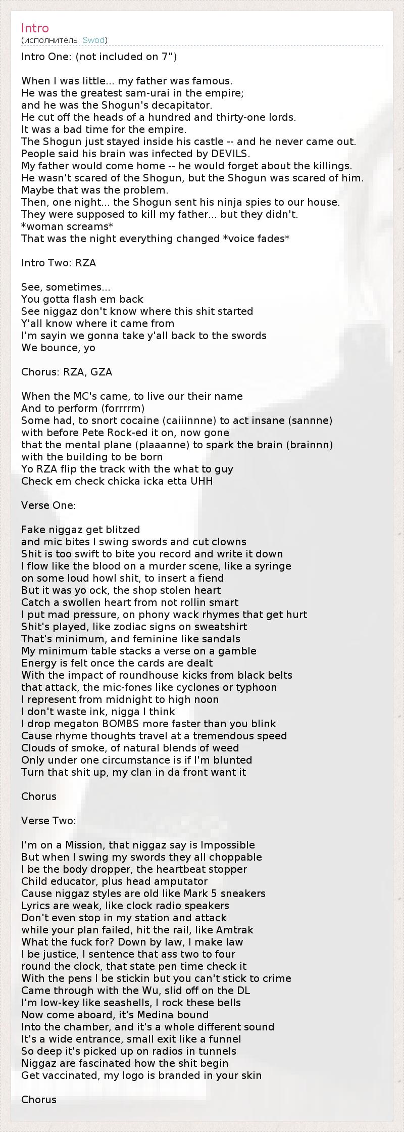 Intro One: (not included on 7") When I was little... my father was famous. He was the greatest sam-urai in the empire; and he was the Shogun's decapitator. He cut off the heads of a hundred and thirty-one lords. It was a bad time for the empire. The Shogun just stayed inside his castle -- and he never came out. People said his brain was infected by DEVILS. My father would come home -- he would forget about the killings. He wasn't scared of the Shogun, but the Shogun was scared of him. Maybe that was the problem. Then, one night... the Shogun sent his ninja spies to our house. They were supposed to kill my father... but they didn't. *woman screams* That was the night everything changed *voice fades* Intro Two: RZA See, sometimes... You gotta flash em back See niggaz don't know where this shit started Y'all know where it came from I'm sayin we gonna take y'all back to the swords We bounce, yo Chorus: RZA, GZA When the MC's came, to live our their name And to perform (forrrrm) Some had, to snort cocaine (caiiinnne) to act insane (sannne) with before Pete Rock-ed it on, now gone that the mental plane (plaaanne) to spark the brain (brainnn) with the building to be born Yo RZA flip the track with the what to guy Check em check chicka icka etta UHH Verse One: Fake niggaz get blitzed and mic bites I swing swords and cut clowns Shit is too swift to bite you record and write it down I flow like the blood on a murder scene, like a syringe on some loud howl shit, to insert a fiend But it was yo ock, the shop stolen heart Catch a swollen heart from not rollin smart I put mad pressure, on phony wack rhymes that get hurt Shit's played, like zodiac signs on sweatshirt That's minimum, and feminine like sandals My minimum table stacks a verse on a gamble Energy is felt once the cards are dealt With the impact of roundhouse kicks from black belts that attack, the mic-fones like cyclones or typhoon I represent from midnight to high noon I don't waste ink, nigga I think I drop megaton BOMBS more faster than you blink Cause rhyme thoughts travel at a tremendous speed Clouds of smoke, of natural blends of weed Only under one circumstance is if I'm blunted Turn that shit up, my clan in da front want it Chorus Verse Two: I'm on a Mission, that niggaz say is Impossible But when I swing my swords they all choppable I be the body dropper, the heartbeat stopper Child educator, plus head amputator Cause niggaz styles are old like Mark 5 sneakers Lyrics are weak, like clock radio speakers Don't even stop in my station and attack while your plan failed, hit the rail, like Amtrak What the fuck for? Down by law, I make law I be justice, I sentence that ass two to four round the clock, that state pen time check it With the pens I be stickin but you can't stick to crime Came through with the Wu, slid off on the DL I'm low-key like seashells, I rock these bells Now come aboard, it's Medina bound Into the chamber, and it's a whole different sound It's a wide entrance, small exit like a funnel So deep it's picked up on radios in tunnels Niggaz are fascinated how the shit begin Get vaccinated, my logo is branded in your skin Chorus