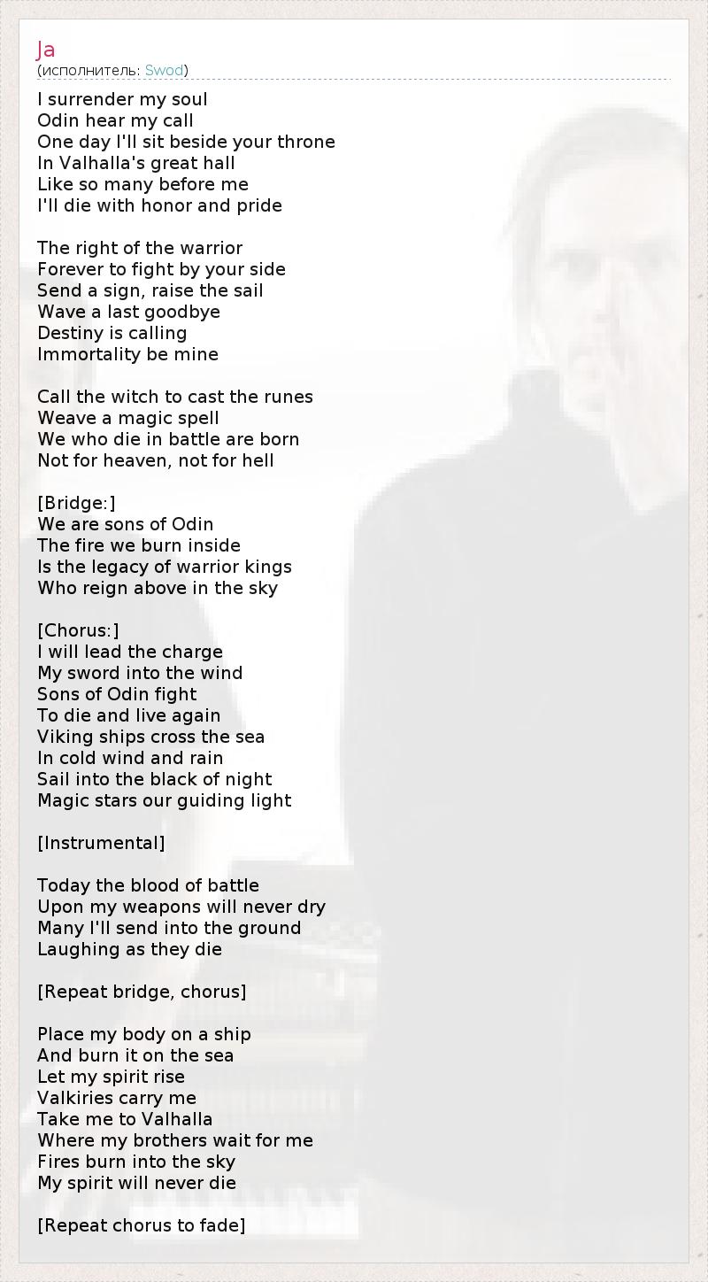 I surrender my soul Odin hear my call One day I'll sit beside your throne In Valhalla's great hall Like so many before me I'll die with honor and pride The right of the warrior Forever to fight by your side Send a sign, raise the sail Wave a last goodbye Destiny is calling Immortality be mine Call the witch to cast the runes Weave a magic spell We who die in battle are born Not for heaven, not for hell [Bridge:] We are sons of Odin The fire we burn inside Is the legacy of warrior kings Who reign above in the sky [Chorus:] I will lead the charge My sword into the wind Sons of Odin fight To die and live again Viking ships cross the sea In cold wind and rain Sail into the black of night Magic stars our guiding light [Instrumental] Today the blood of battle Upon my weapons will never dry Many I'll send into the ground Laughing as they die [Repeat bridge, chorus] Place my body on a ship And burn it on the sea Let my spirit rise Valkiries carry me Take me to Valhalla Where my brothers wait for me Fires burn into the sky My spirit will never die [Repeat chorus to fade]