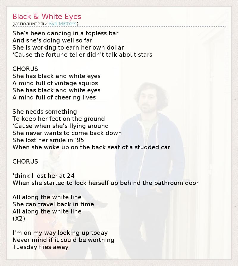She's been dancing in a topless bar And she's doing well so far She is working to earn her own dollar ‘Cause the fortune teller didn't talk about stars CHORUS She has black and white eyes A mind full of vintage squibs She has black and white eyes A mind full of cheering lives She needs something To keep her feet on the ground ‘Cause when she's flying around She never wants to come back down She lost her smile in '95 When she woke up on the back seat of a studded car CHORUS 'think I lost her at 24 When she started to lock herself up behind the bathroom door All along the white line She can travel back in time All along the white line (X2) I'm on my way looking up today Never mind if it could be worthing Tuesday flies away