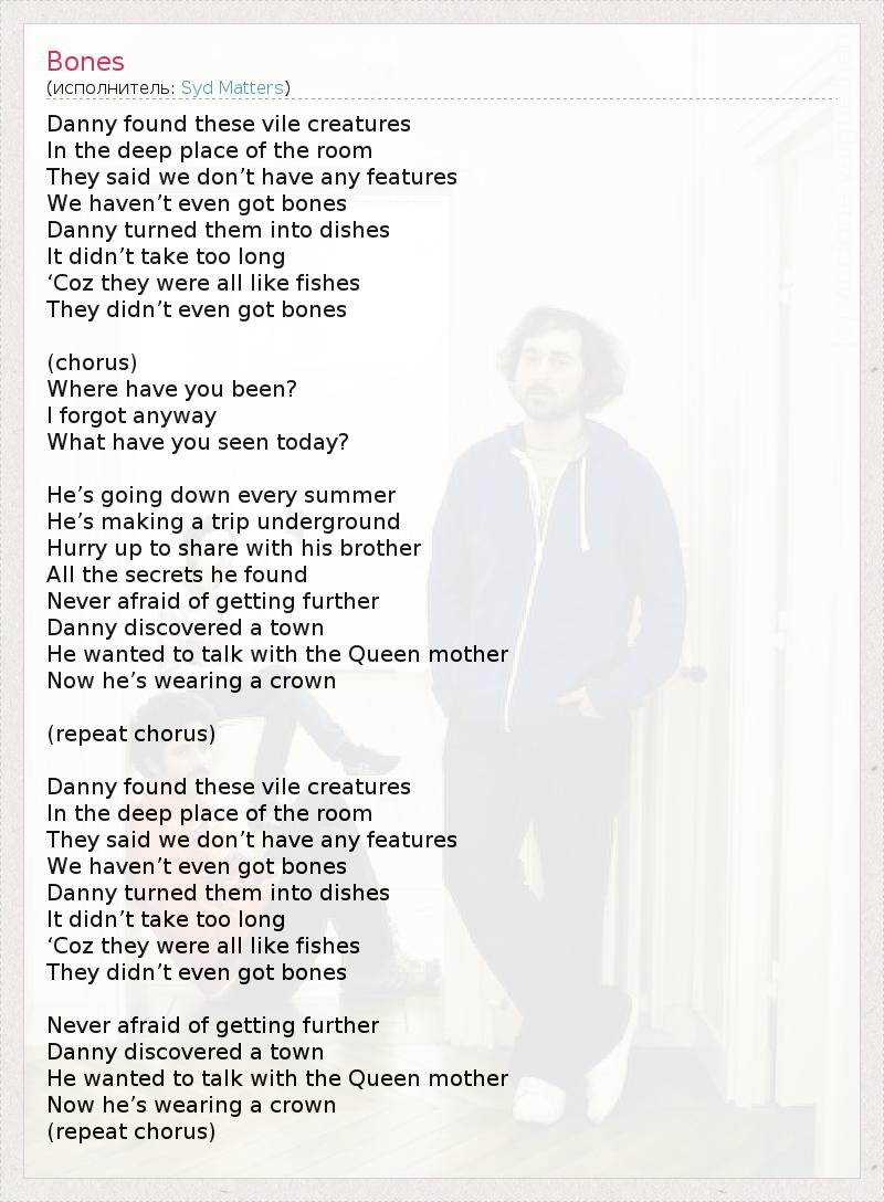 Danny found these vile creatures In the deep place of the room They said we don’t have any features We haven’t even got bones Danny turned them into dishes It didn’t take too long ‘Coz they were all like fishes They didn’t even got bones (chorus) Where have you been? I forgot anyway What have you seen today? He’s going down every summer He’s making a trip underground Hurry up to share with his brother All the secrets he found Never afraid of getting further Danny discovered a town He wanted to talk with the Queen mother Now he’s wearing a crown (repeat chorus) Danny found these vile creatures In the deep place of the room They said we don’t have any features We haven’t even got bones Danny turned them into dishes It didn’t take too long ‘Coz they were all like fishes They didn’t even got bones Never afraid of getting further Danny discovered a town He wanted to talk with the Queen mother Now he’s wearing a crown (repeat chorus)