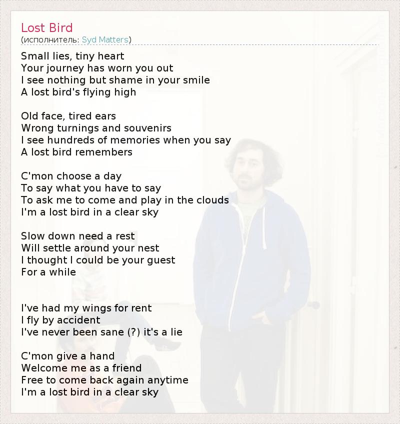 Small lies, tiny heart Your journey has worn you out I see nothing but shame in your smile A lost bird's flying high Old face, tired ears Wrong turnings and souvenirs I see hundreds of memories when you say A lost bird remembers C'mon choose a day To say what you have to say To ask me to come and play in the clouds I'm a lost bird in a clear sky Slow down need a rest Will settle around your nest I thought I could be your guest For a while I've had my wings for rent I fly by accident I've never been sane (?) it's a lie C'mon give a hand Welcome me as a friend Free to come back again anytime I'm a lost bird in a clear sky
