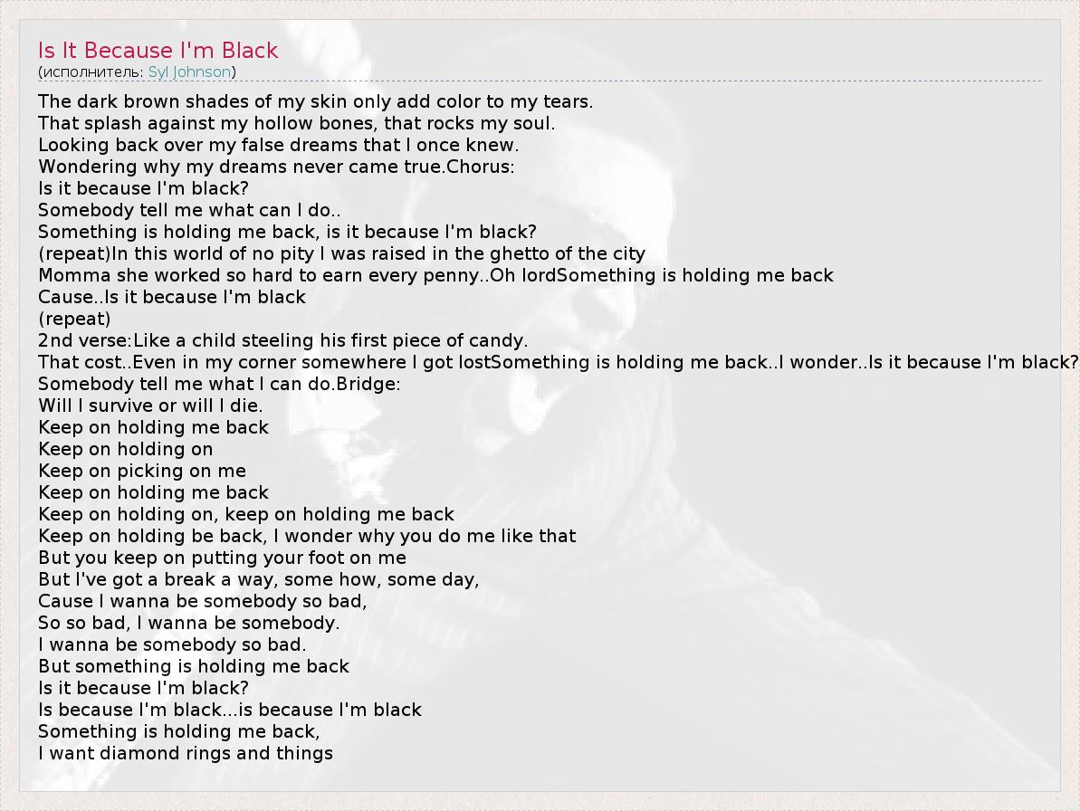 The dark brown shades of my skin only add color to my tears. That splash against my hollow bones, that rocks my soul. Looking back over my false dreams that I once knew. Wondering why my dreams never came true.Chorus: Is it because I'm black? Somebody tell me what can I do.. Something is holding me back, is it because I'm black? (repeat)In this world of no pity I was raised in the ghetto of the city Momma she worked so hard to earn every penny..Oh lordSomething is holding me back Cause..Is it because I'm black (repeat) 2nd verse:Like a child steeling his first piece of candy. That cost..Even in my corner somewhere I got lostSomething is holding me back..I wonder..Is it because I'm black? Somebody tell me what I can do.Bridge: Will I survive or will I die. Keep on holding me back Keep on holding on Keep on picking on me Keep on holding me back Keep on holding on, keep on holding me back Keep on holding be back, I wonder why you do me like that But you keep on putting your foot on me But I've got a break a way, some how, some day, Cause I wanna be somebody so bad, So so bad, I wanna be somebody. I wanna be somebody so bad. But something is holding me back Is it because I'm black? Is because I'm black...is because I'm black Something is holding me back, I want diamond rings and things